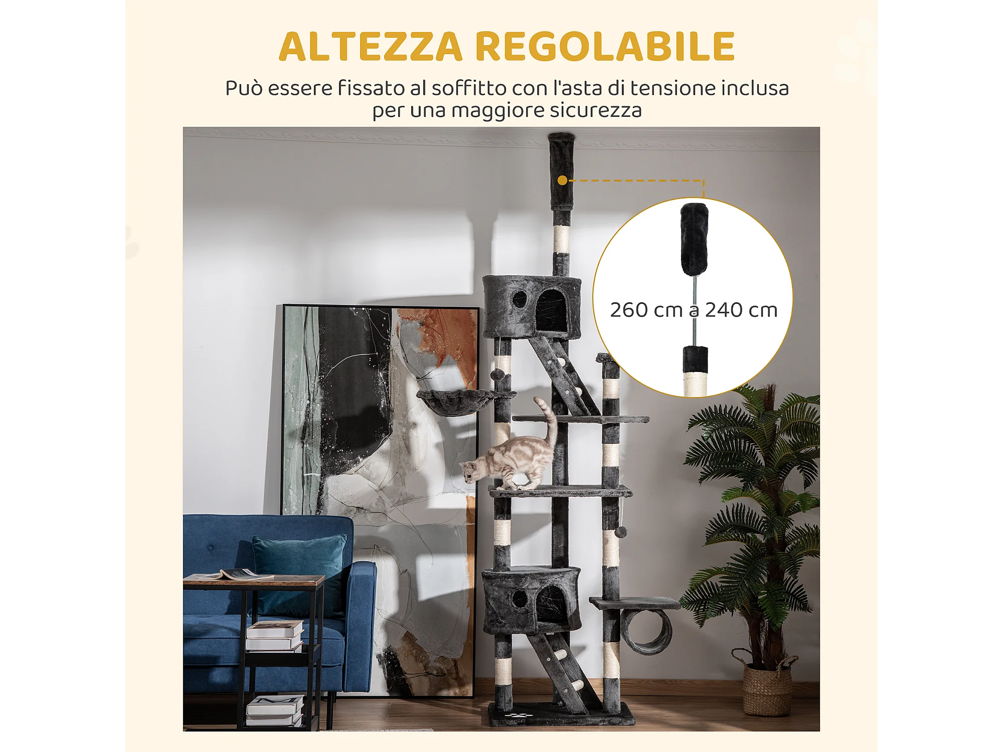 Albero tiragraffi a 4 livelli ad altezza regolabile in truciolato grigio