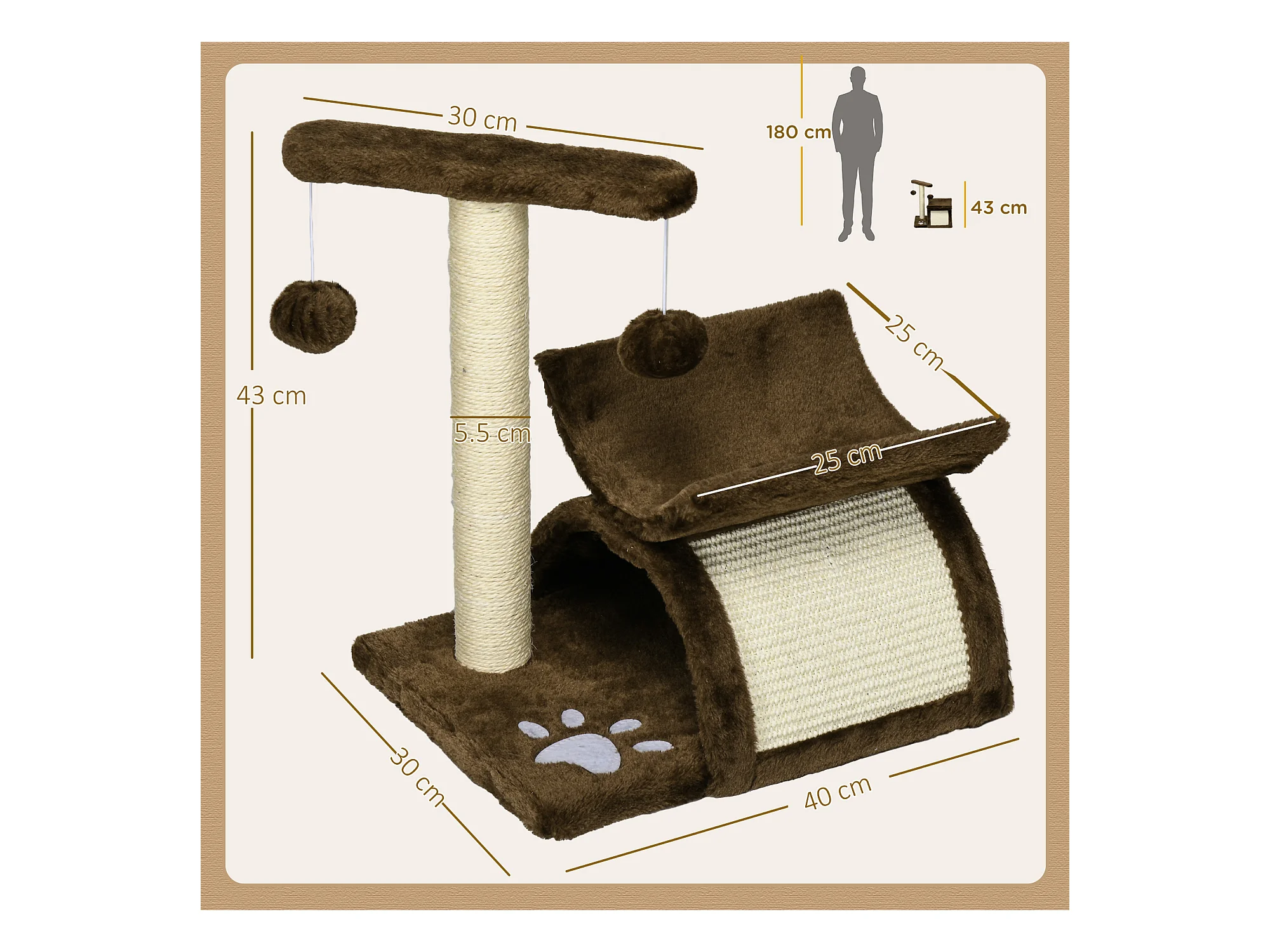 Tiragraffi per gatti con cuccia in peluche marrone 43cm