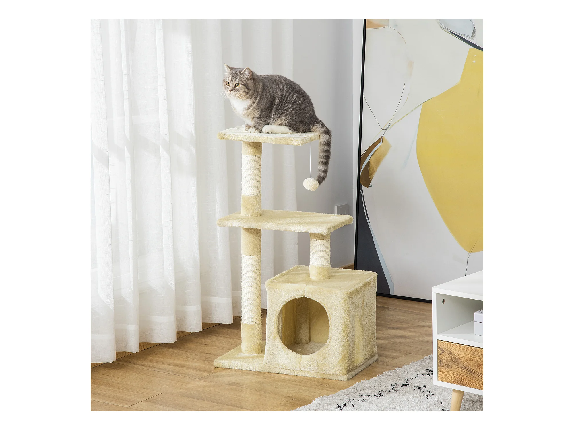 Tiragraffi per gatti con cuccia, pallina e pali in corda sisal, beige