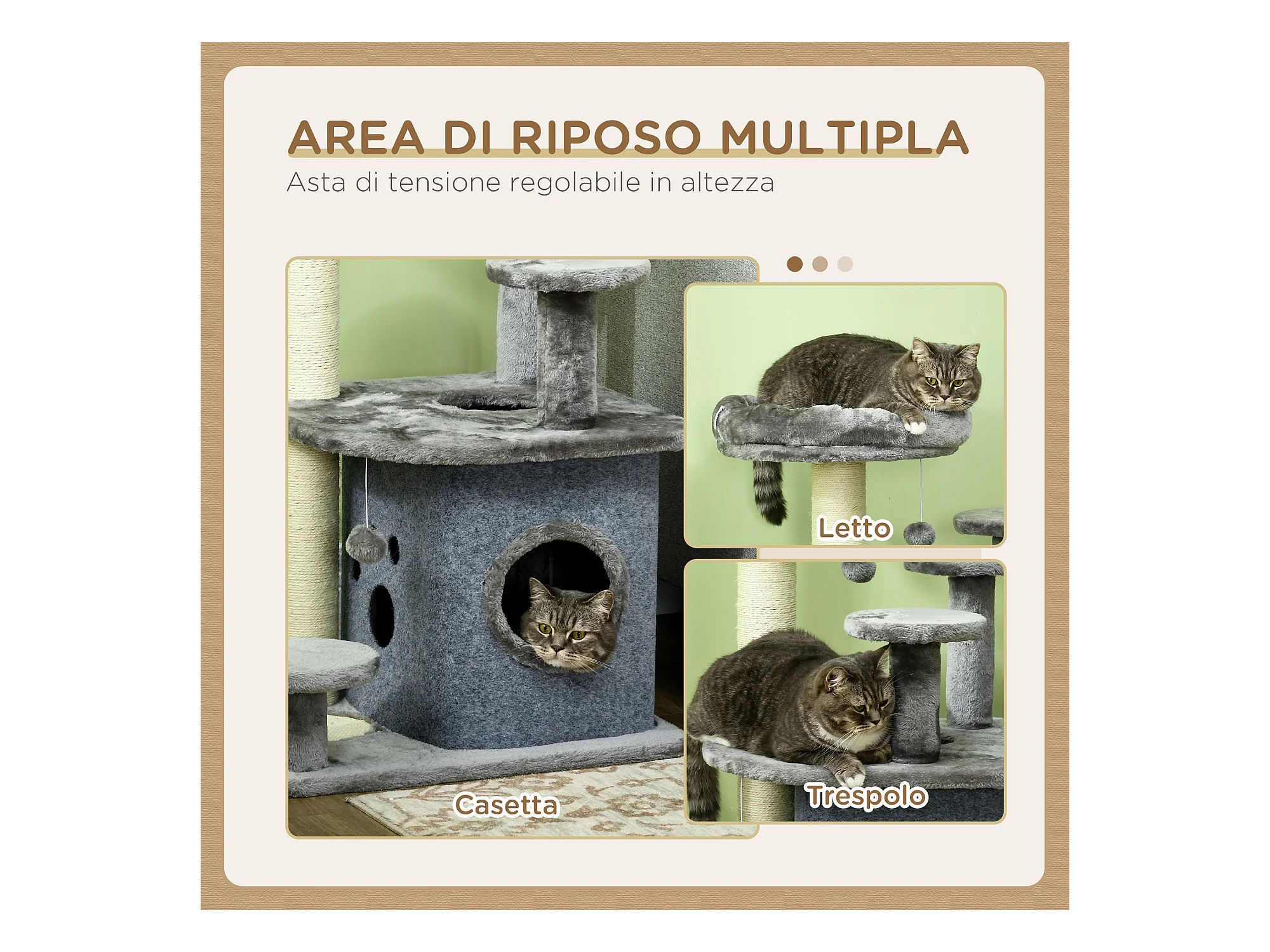 Albero tiragraffi per gatti alto 200cm con casette e amache grigio chiaro