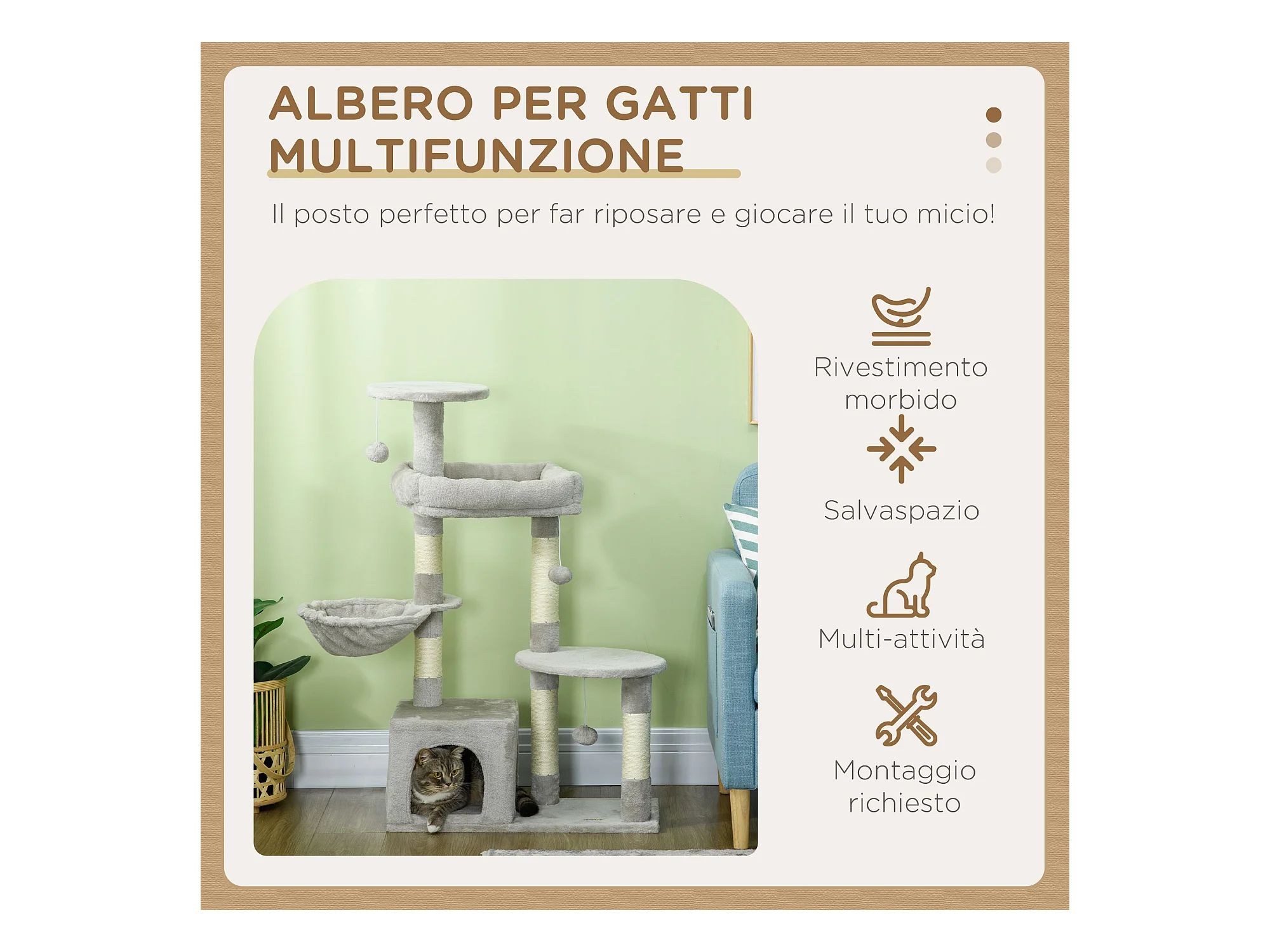 Tiragraffi per gatti in truciolato con casetta posatoi e trespoli