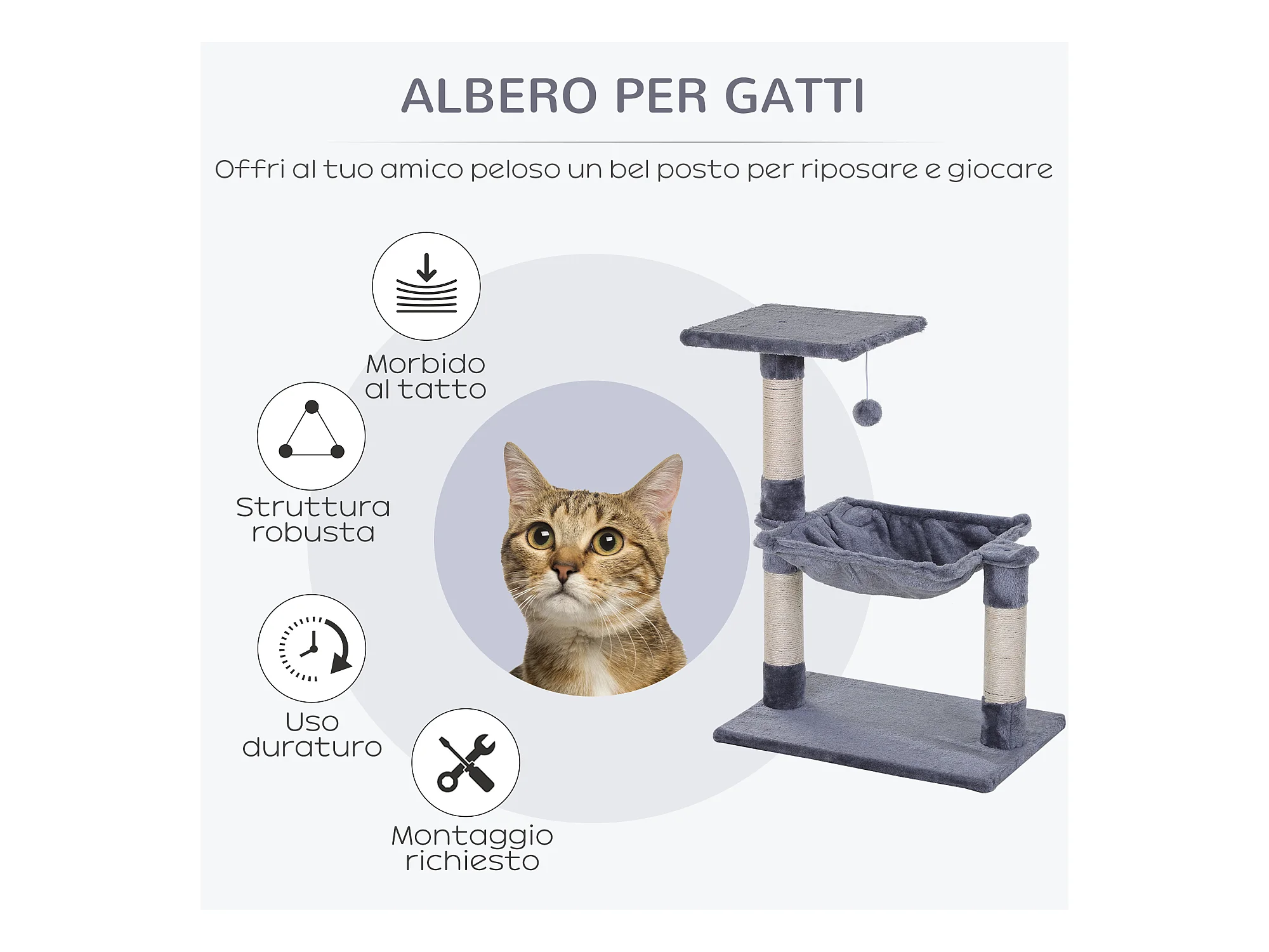 Tiragraffi per gatti in peluche con palo sisal, cuccia e 2 palline grigio