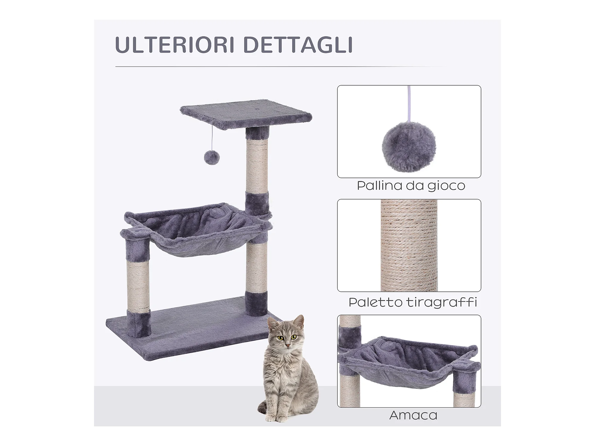 Tiragraffi per gatti multilivello con amaca e pallina 50x36x70cm grigio