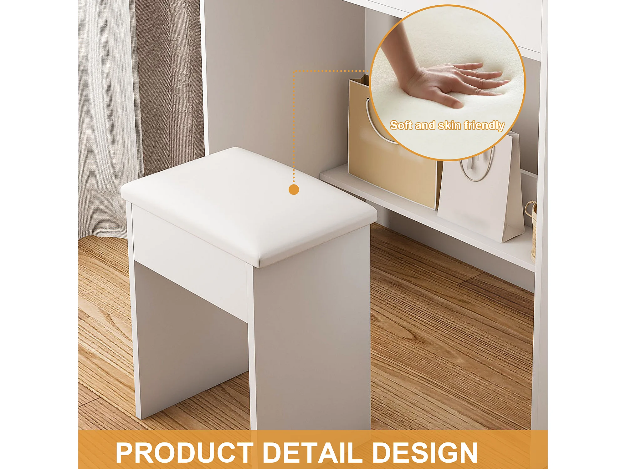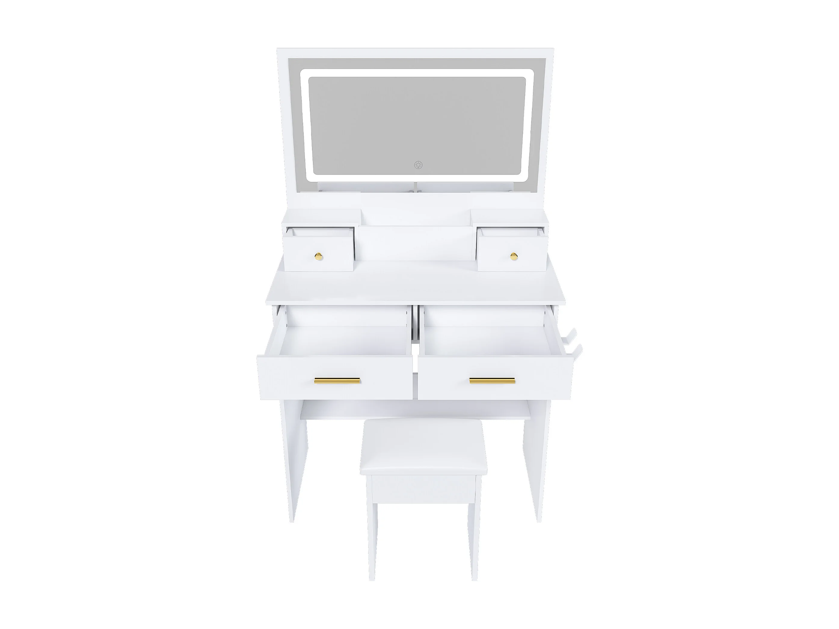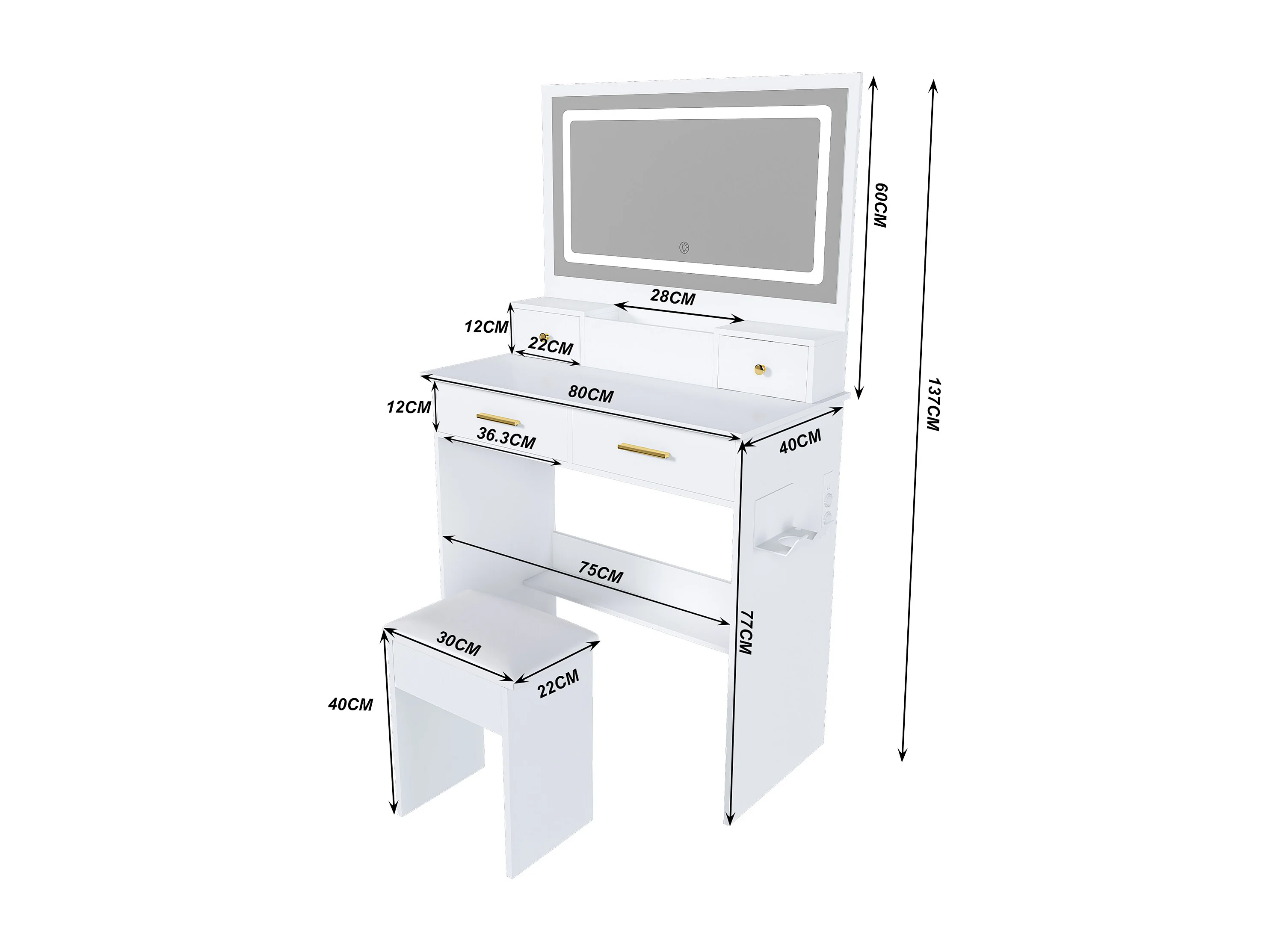 Toletta con specchio LED, sgabello, presa elettrica e 4 cassetti - Bianco