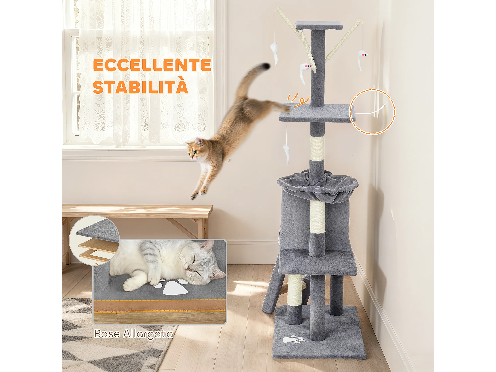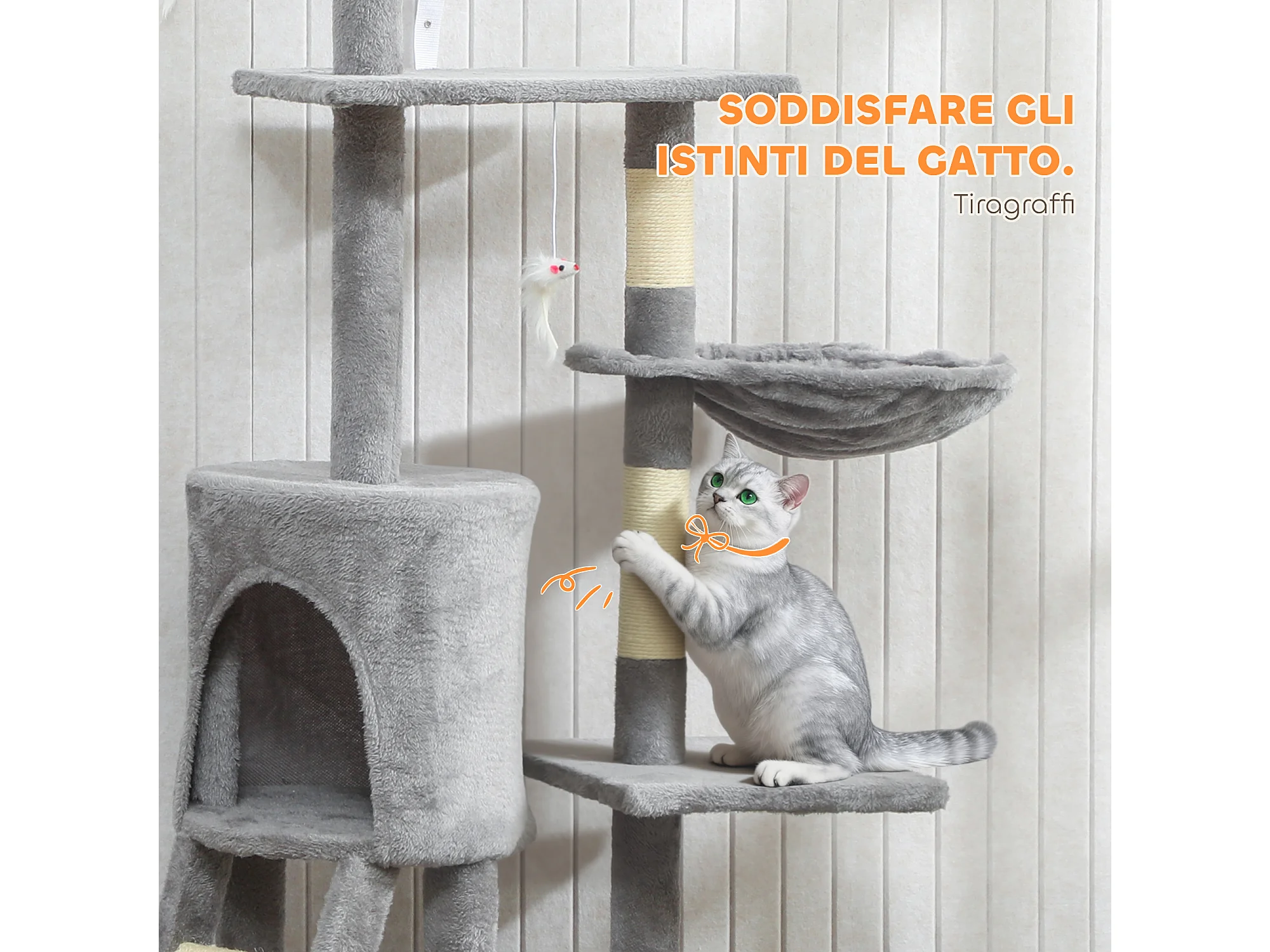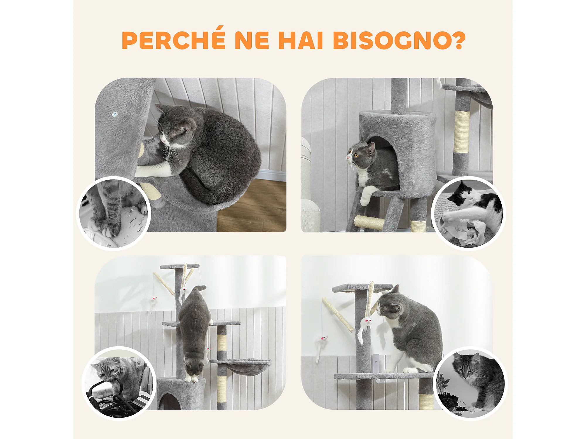 Torre per gatti con casetta, trespolo e 4 topolini 60x35x134 cm grigio