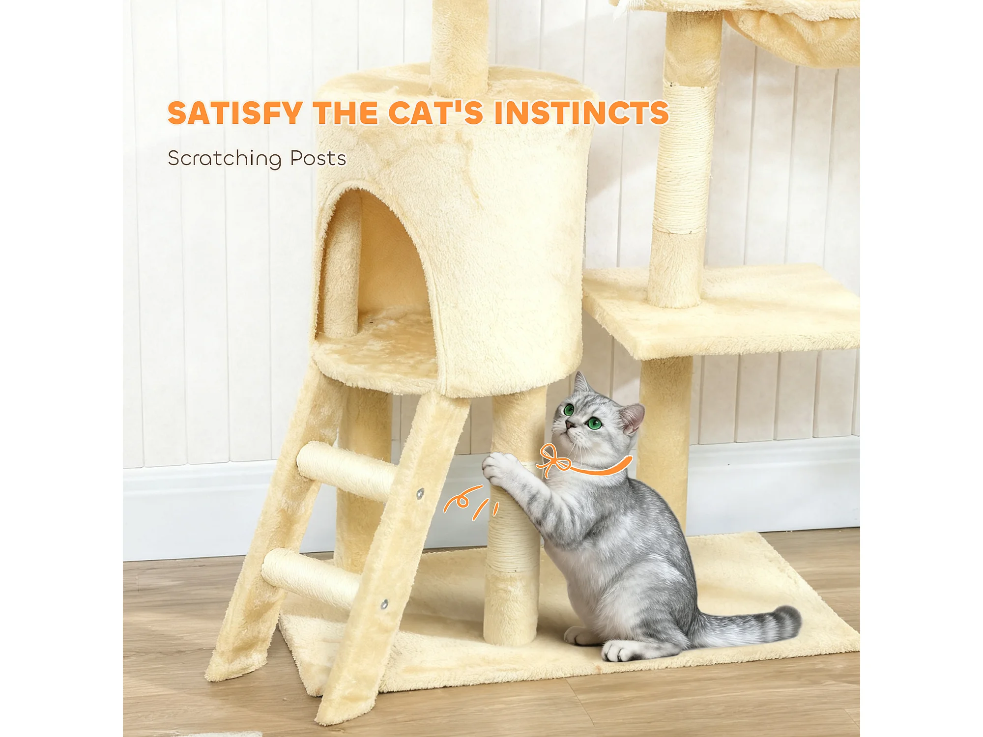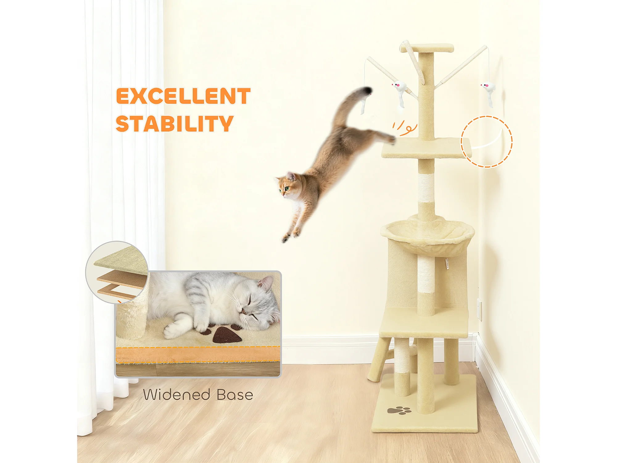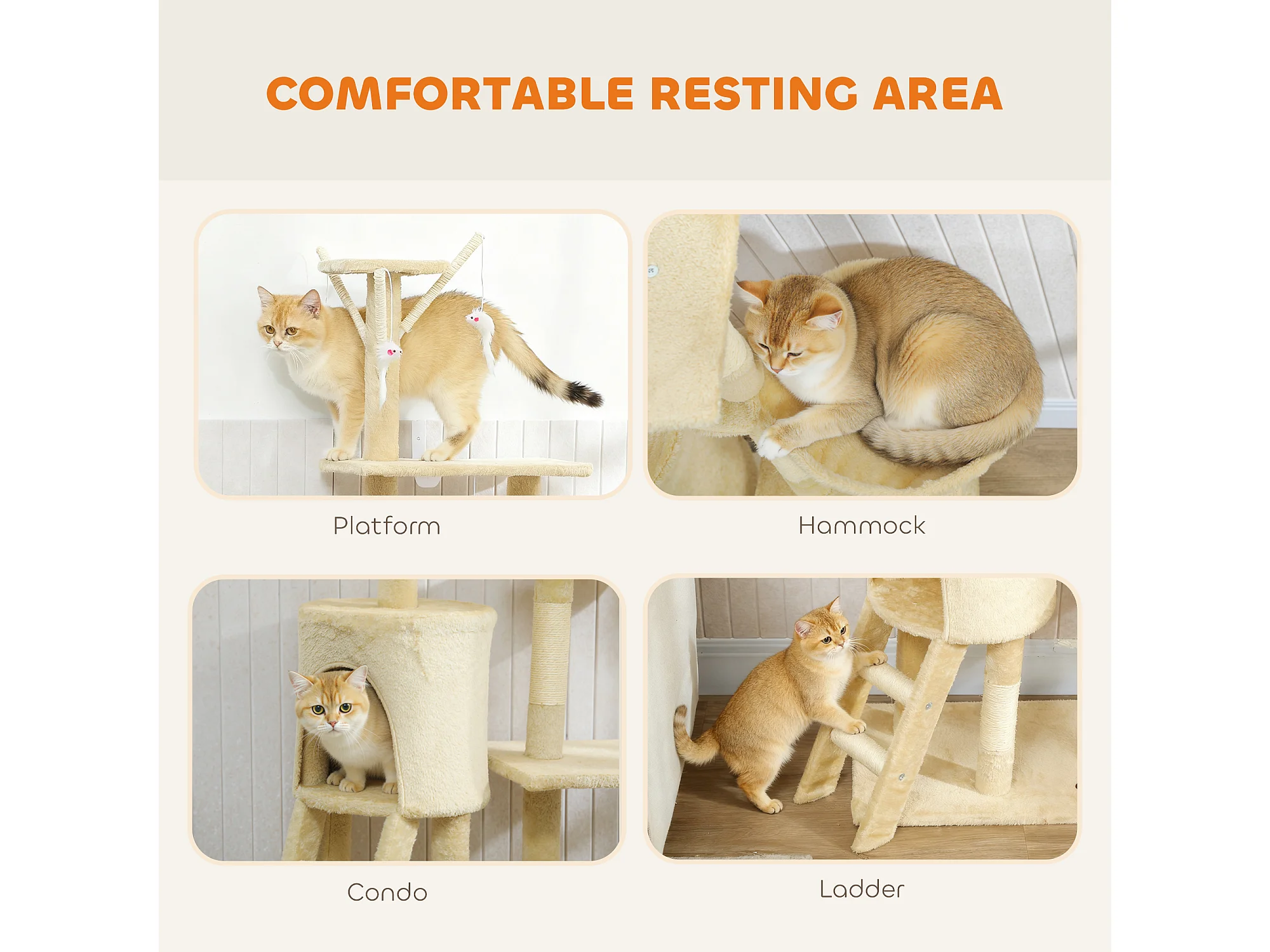 Torre per gatti con casetta, trespolo, piattaforme e 4 topolini beige