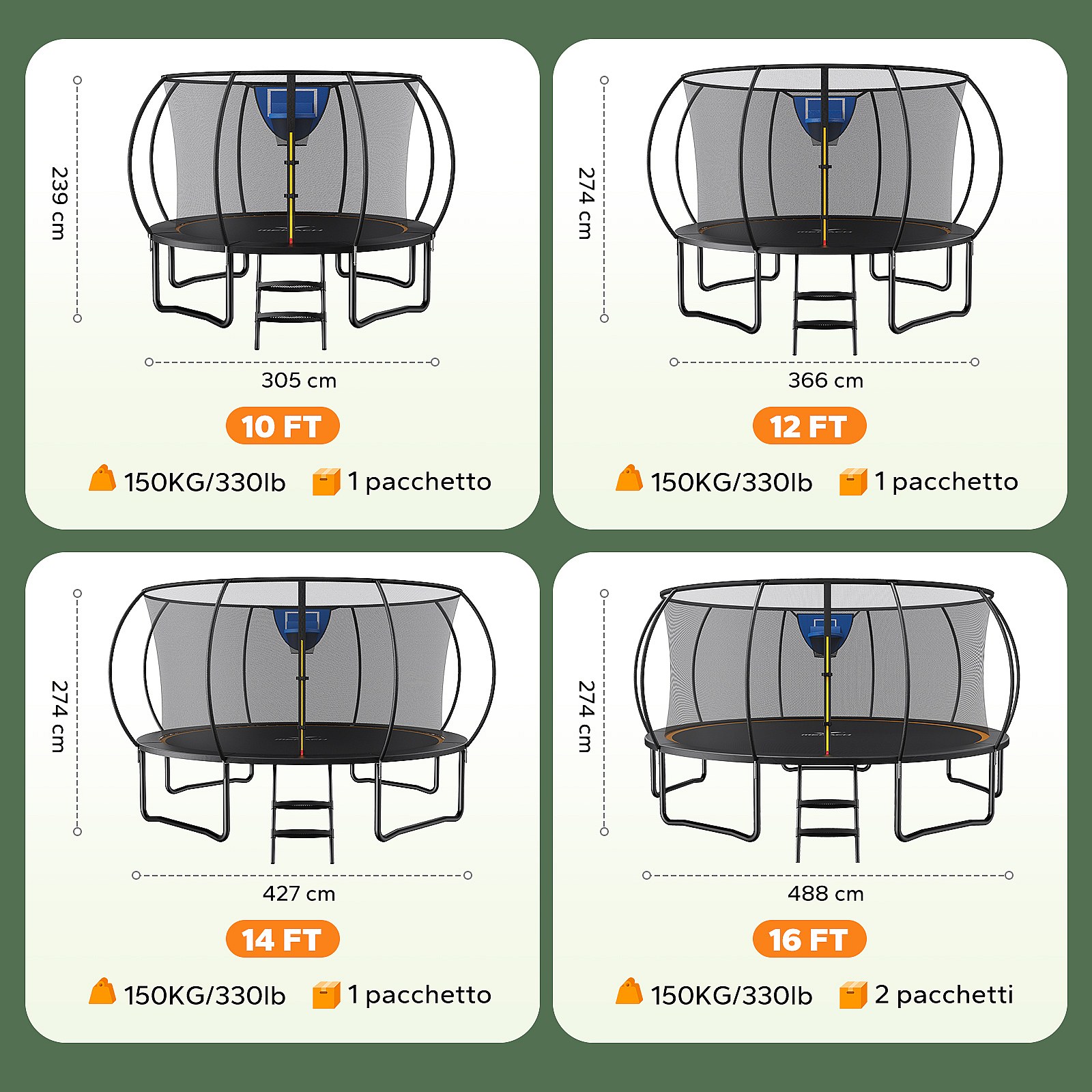 Trampolino da giardino MERACH, Ø 427 cm, rete di sicurezza inclusa, ideale per gioco all’aperto, rimbalzo potente e stabile, fino a 150 kg