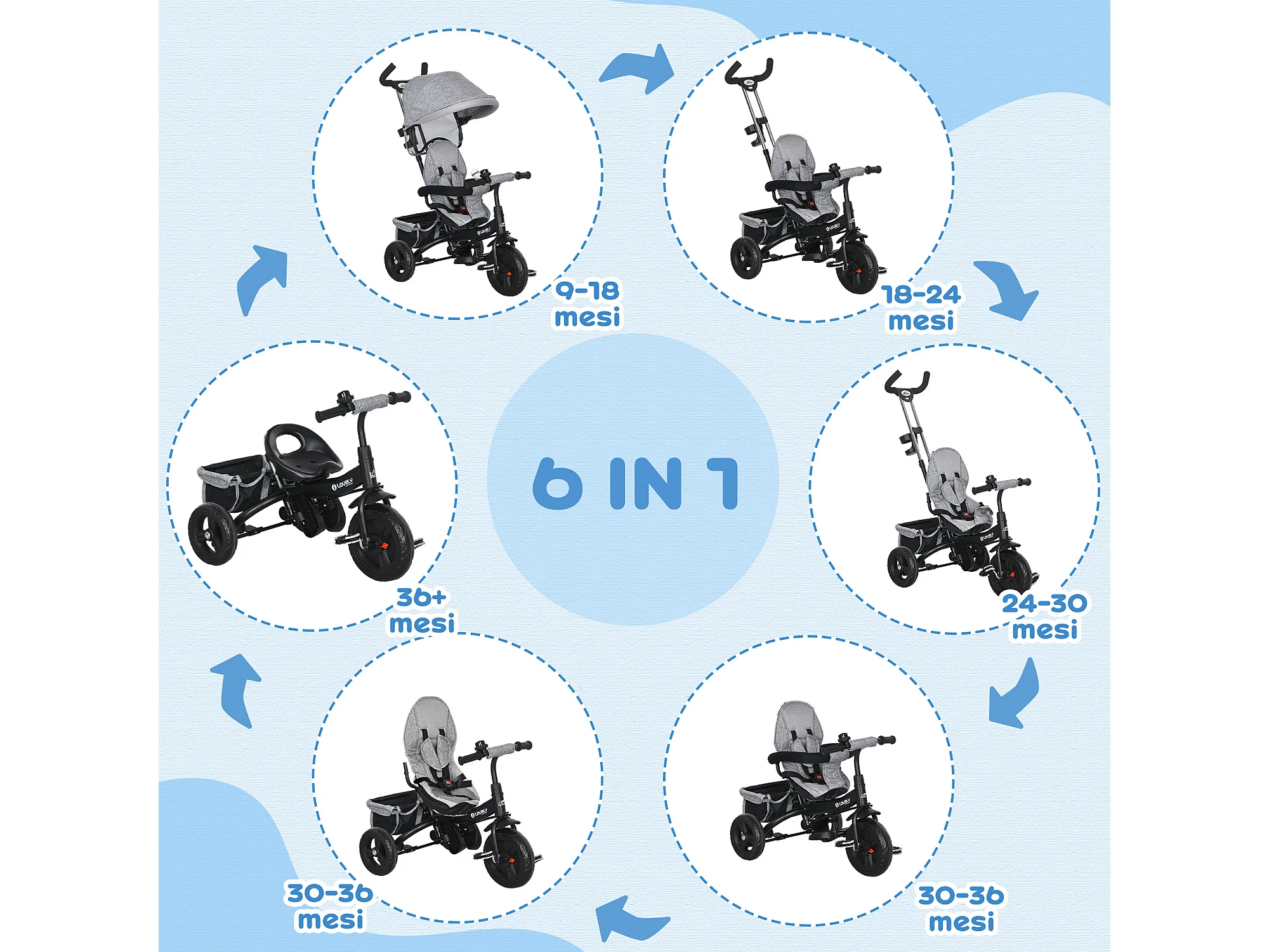 Triciclo passeggino con maniglione e tettuccio regolabile grigio