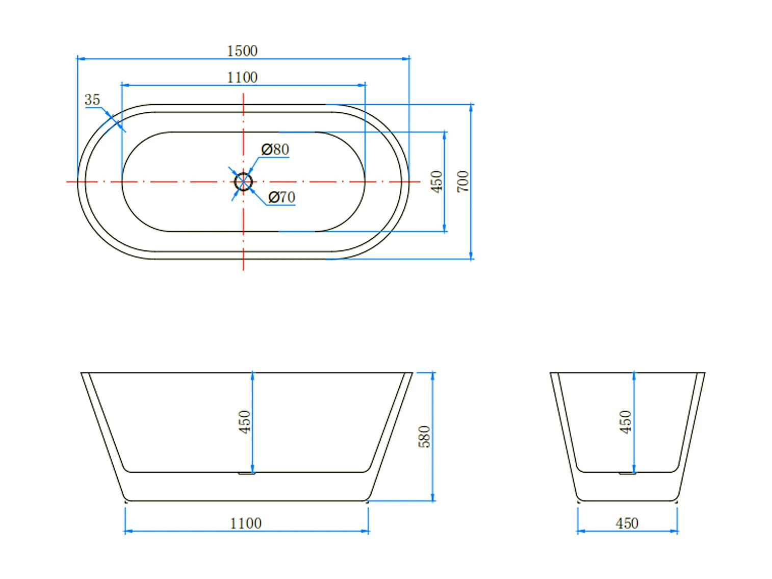 Vasca da Bagno a Isola 150x70x58 cm Vasca da Bagno Freestanding in Acrilico Bianco Ovale