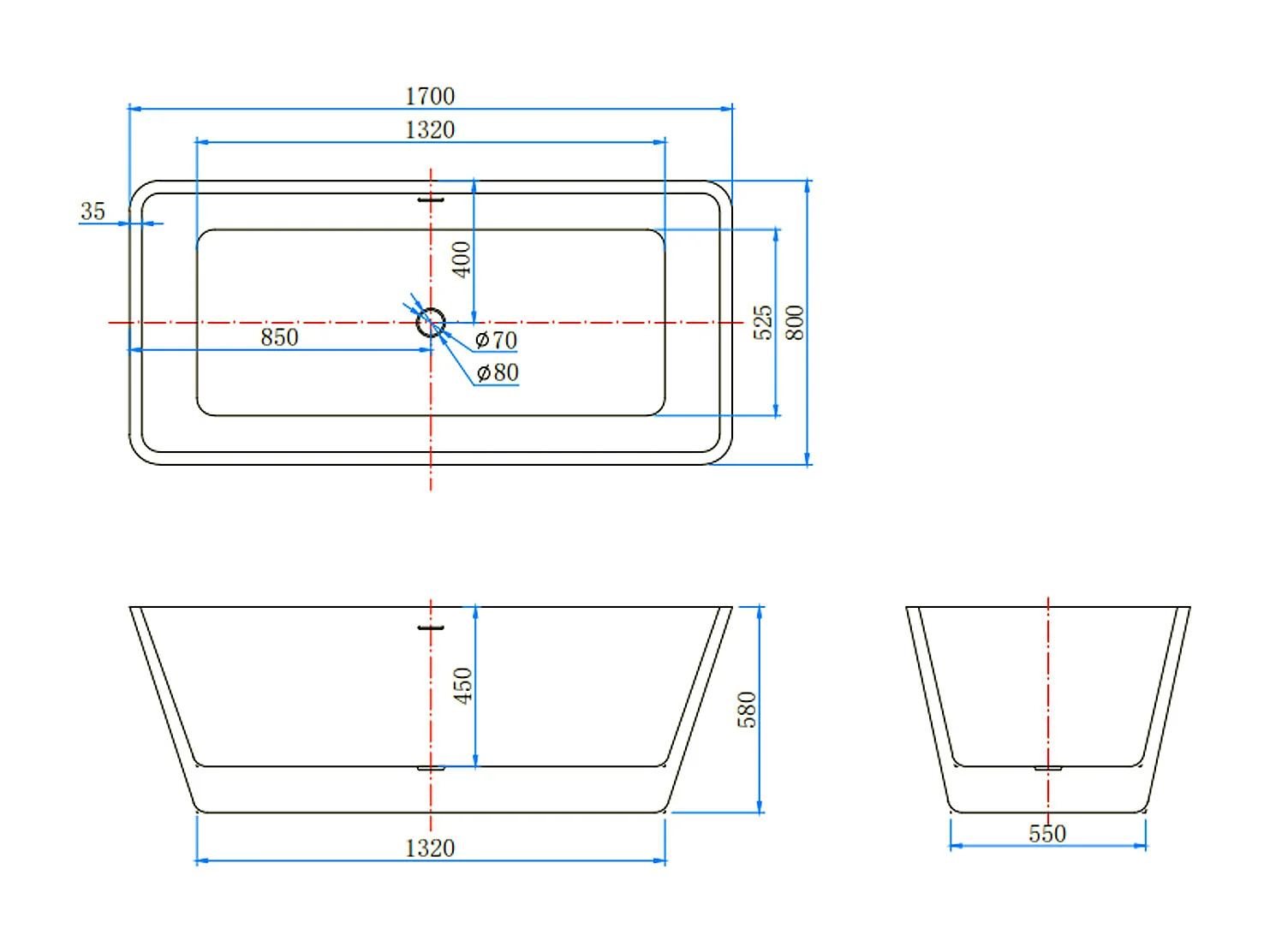 Vasca da Bagno a Isola 170x80x58 cm Vasca da Bagno Freestanding in Acrilico Bianco Rettangolare
