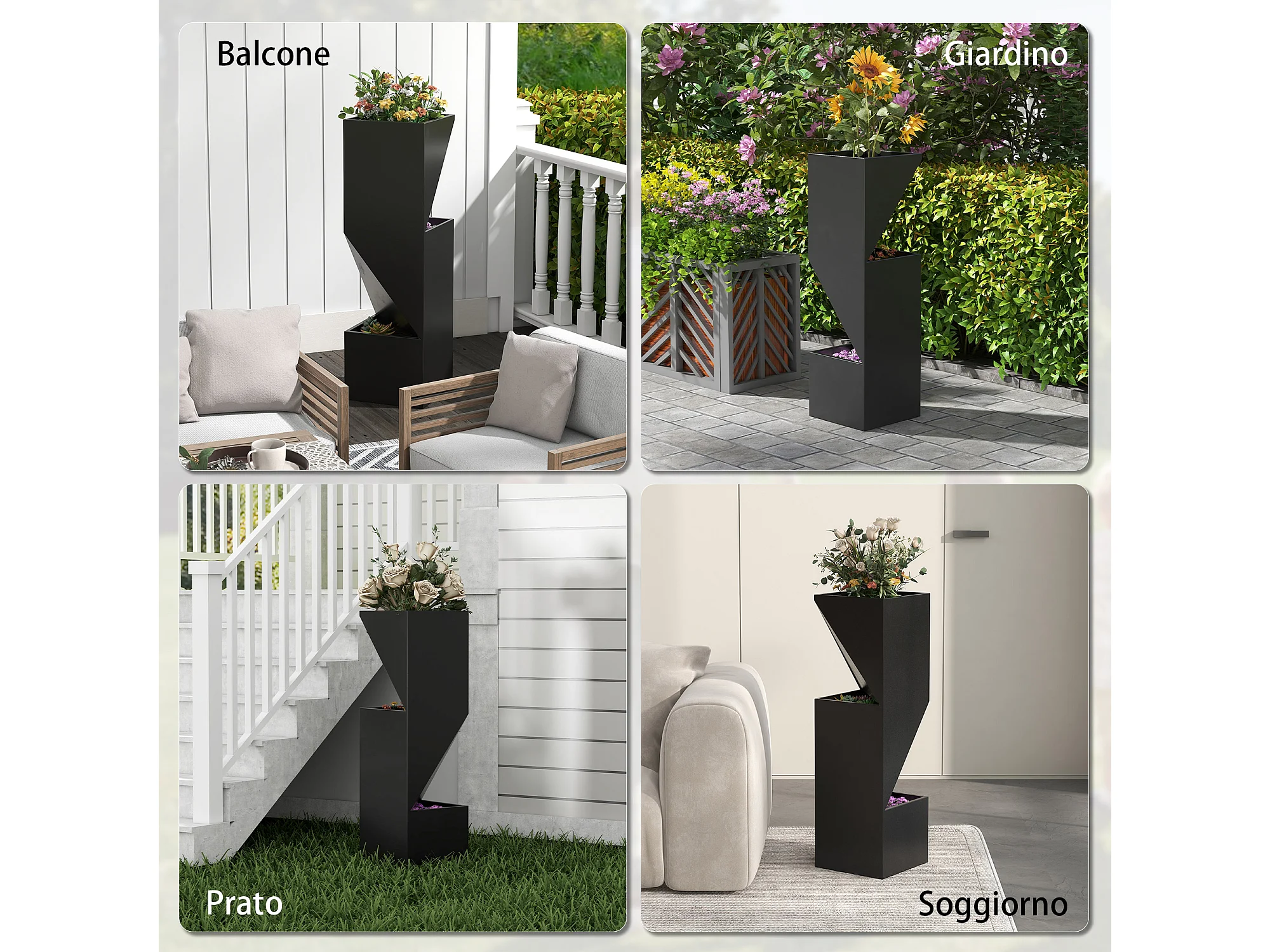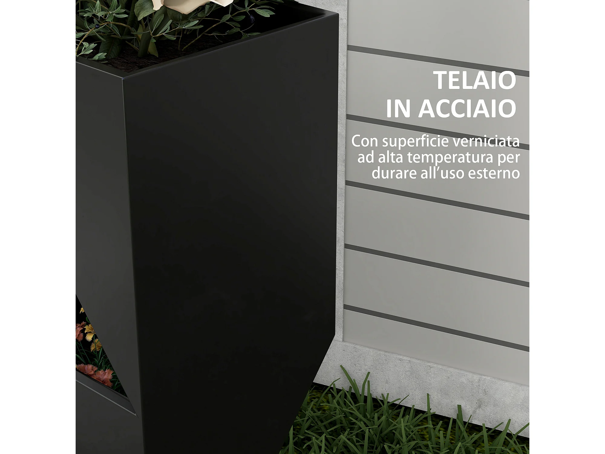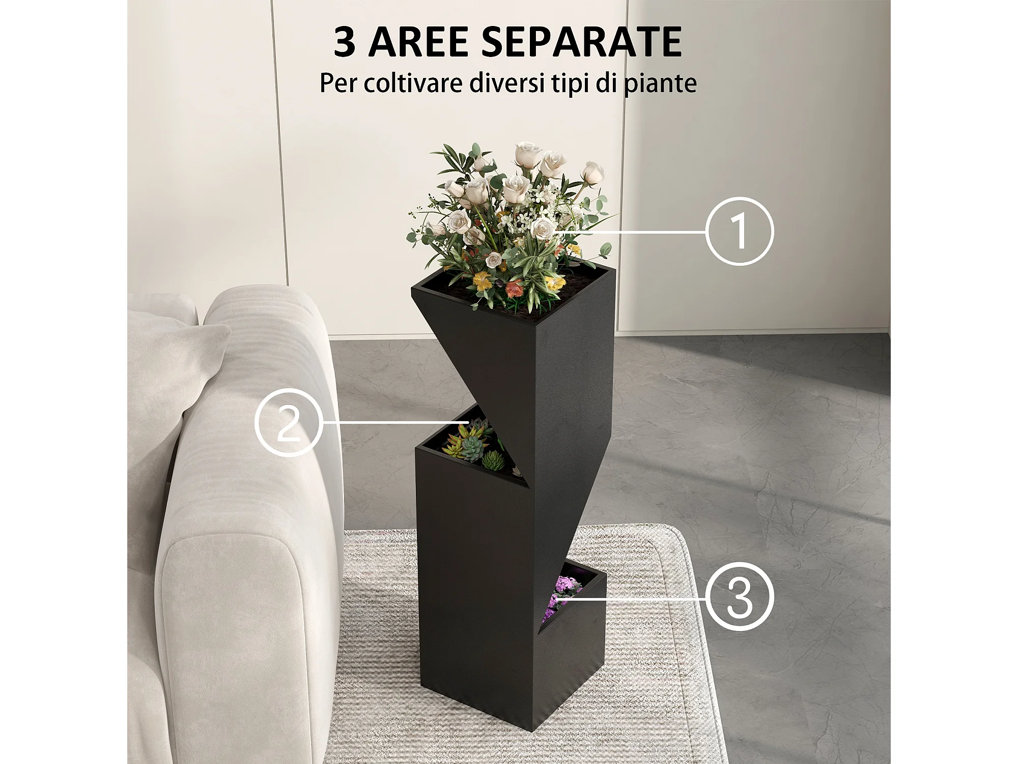 Vaso fioriera da esterno in metallo nero con 3 aree di coltivazione