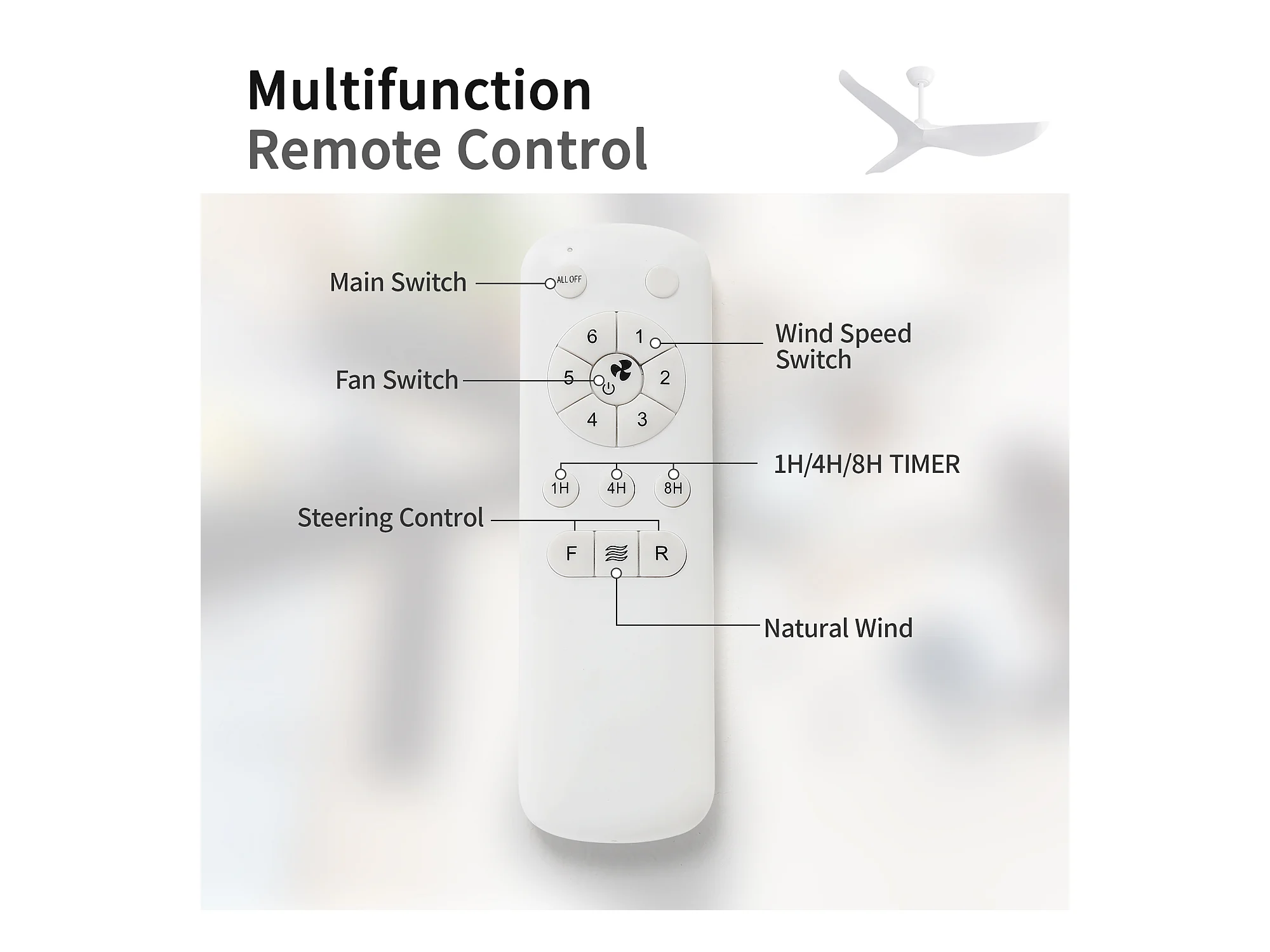 Ventilatore da soffitto a 3 pale da 96,5 cm con telecomando, 6 velocità e timer regolabile, motore DC reversibile, bianco