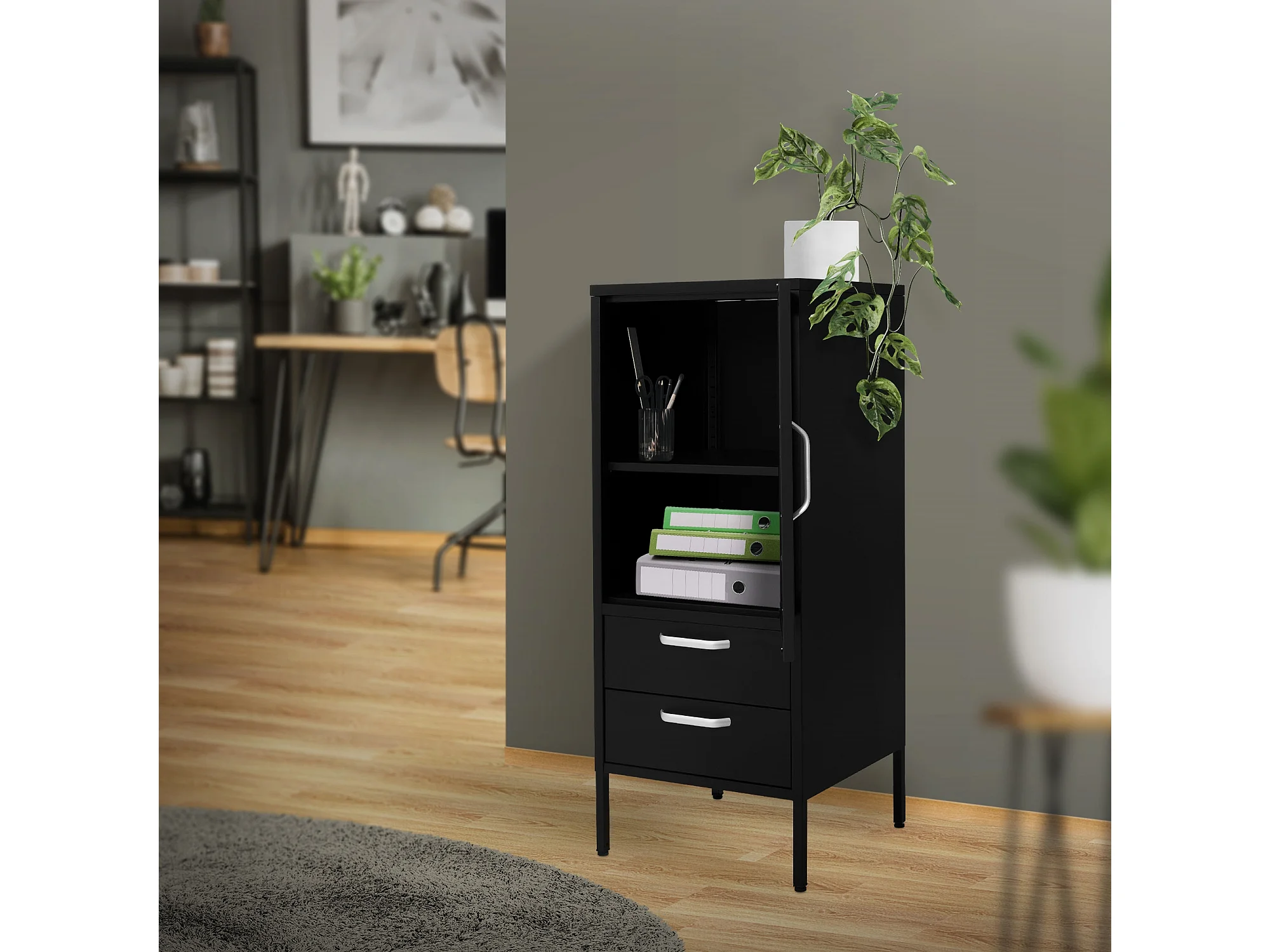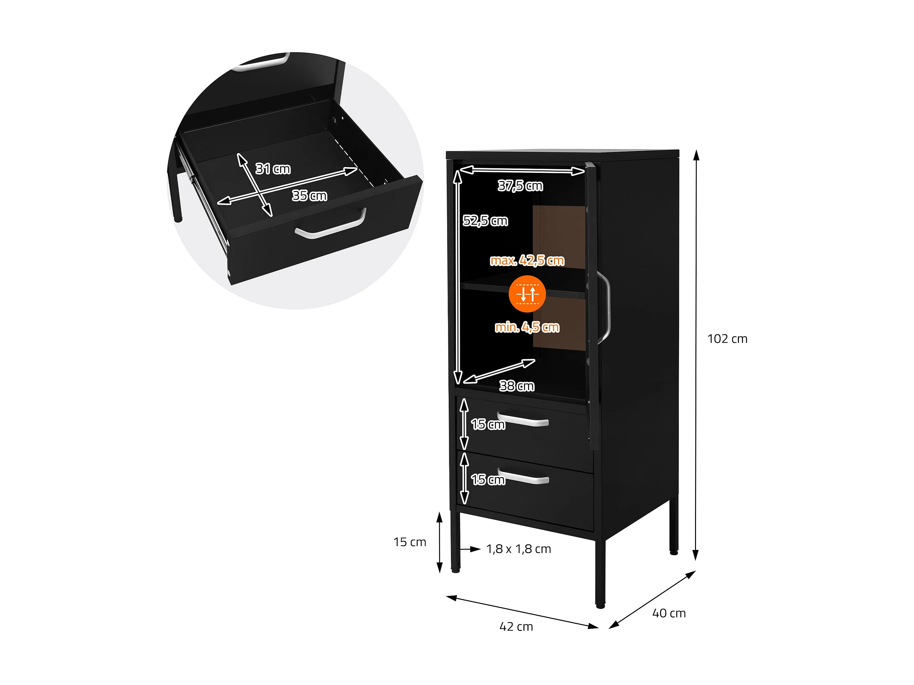 Vetrina 42x102x40 cm Nera con 2 Ripiani 1 Anta & 2 Cassetti Armadio in Acciaio