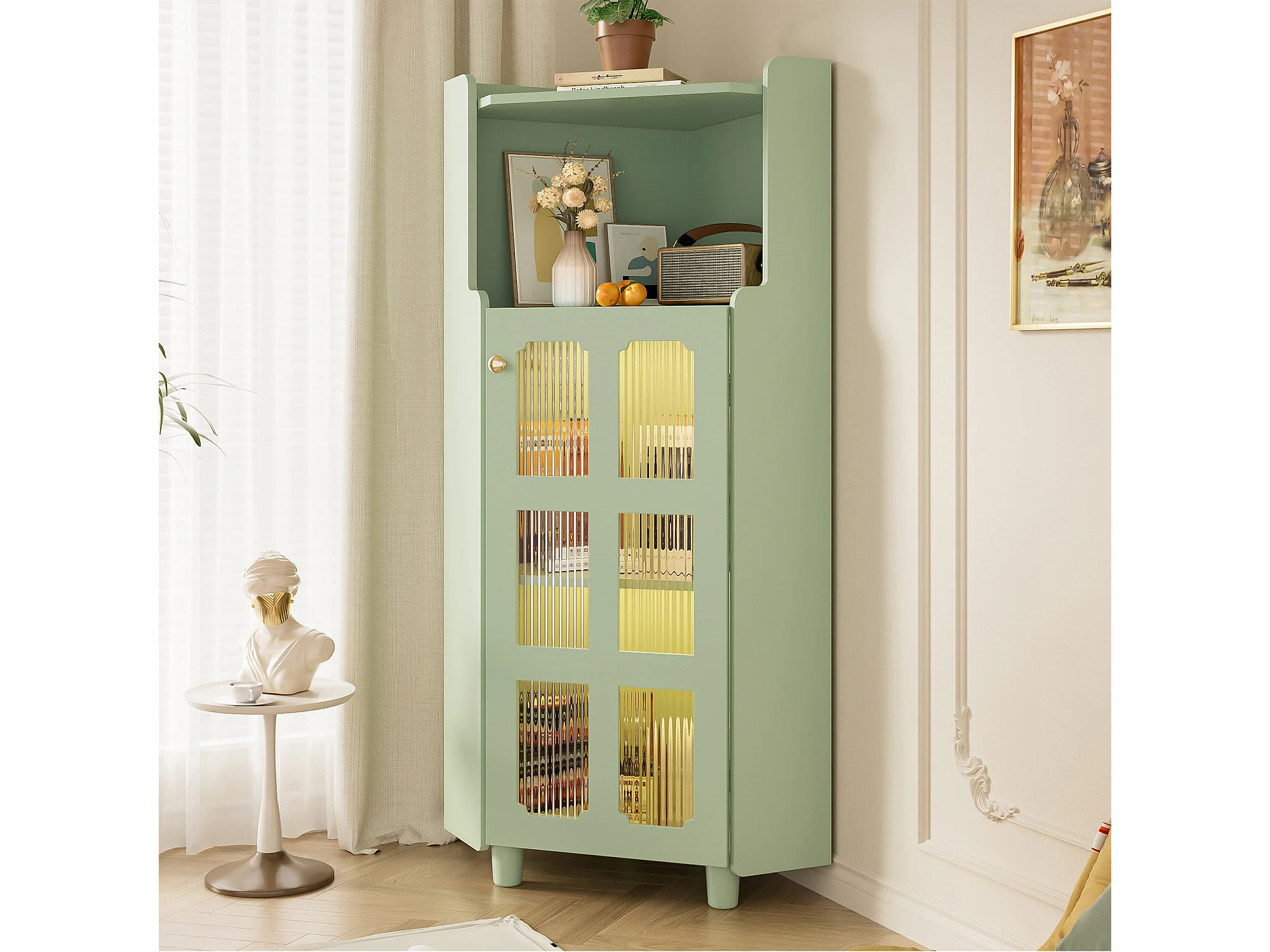 Vetrina angolare verde con illuminazione a LED e 2 ante in vetro - Legno MDF