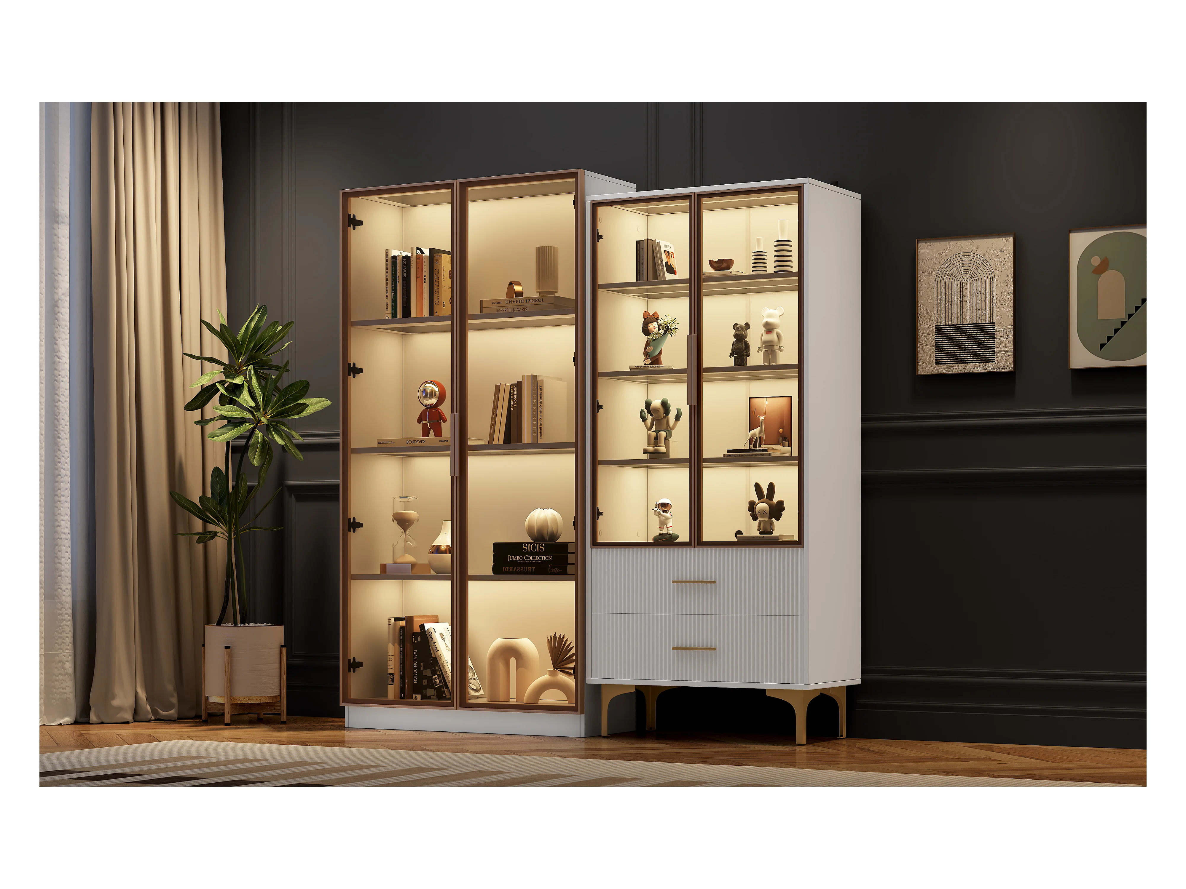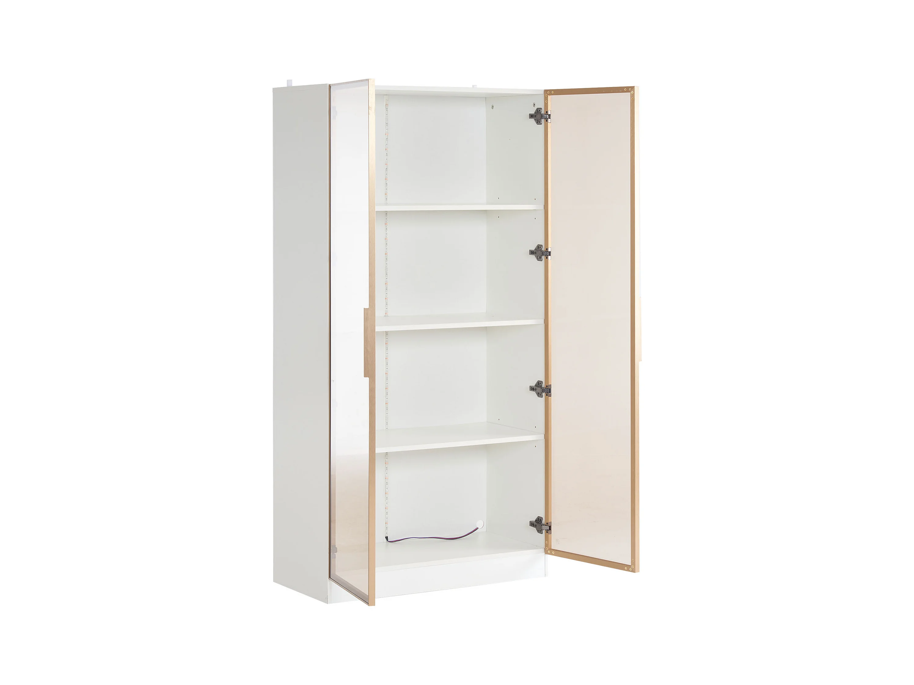 Vetrina da salone LED bianca in legno di vetro con 2 mobili disposti in alto 80x40x160cm e 70x35x150cm