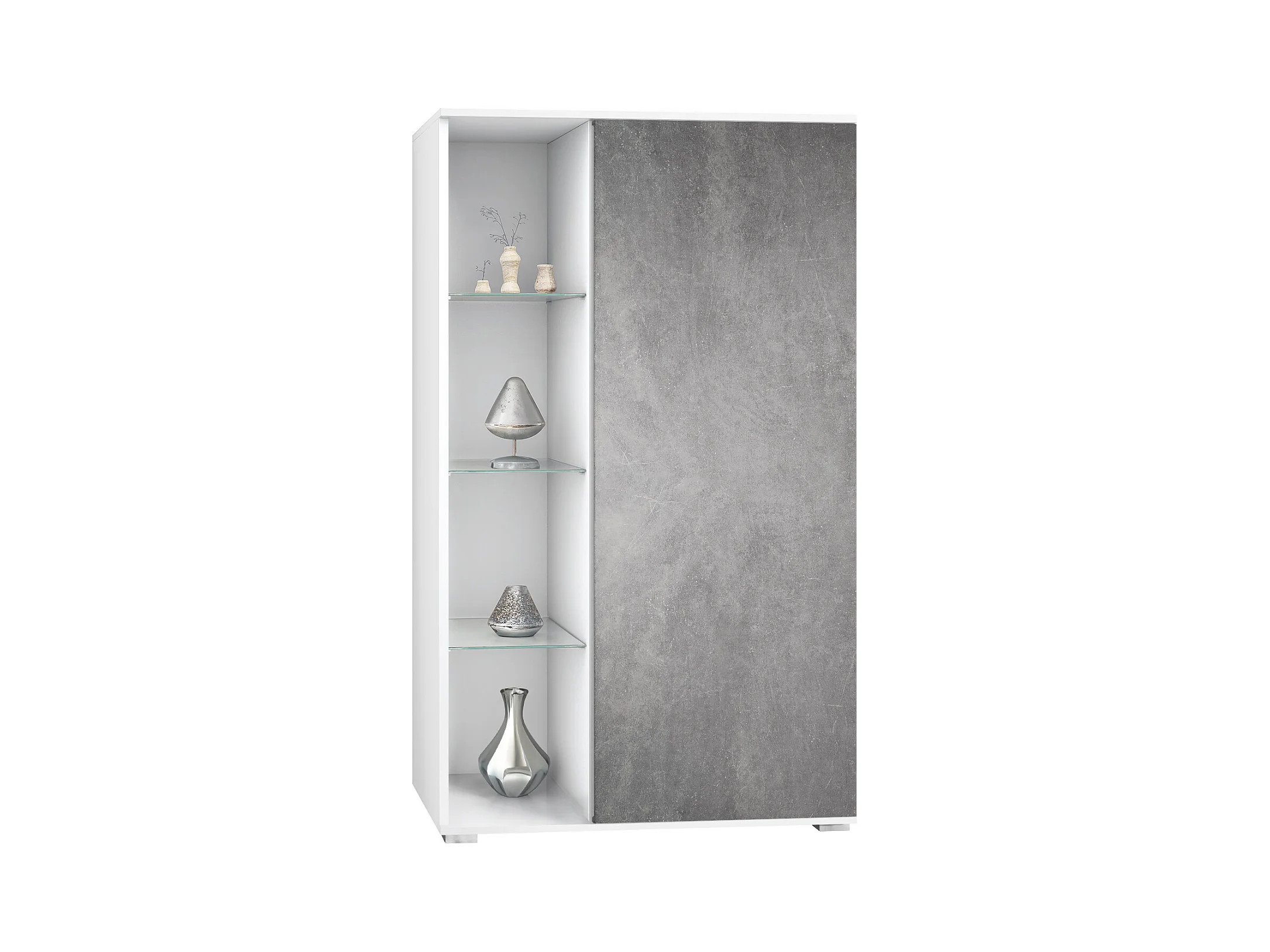 Vetrina Davos, vetrina indipendente con 3 ripiani in vetro e 8 vani, bianco opaco/Grigio pietra (71,5 x 134 x 35 cm)