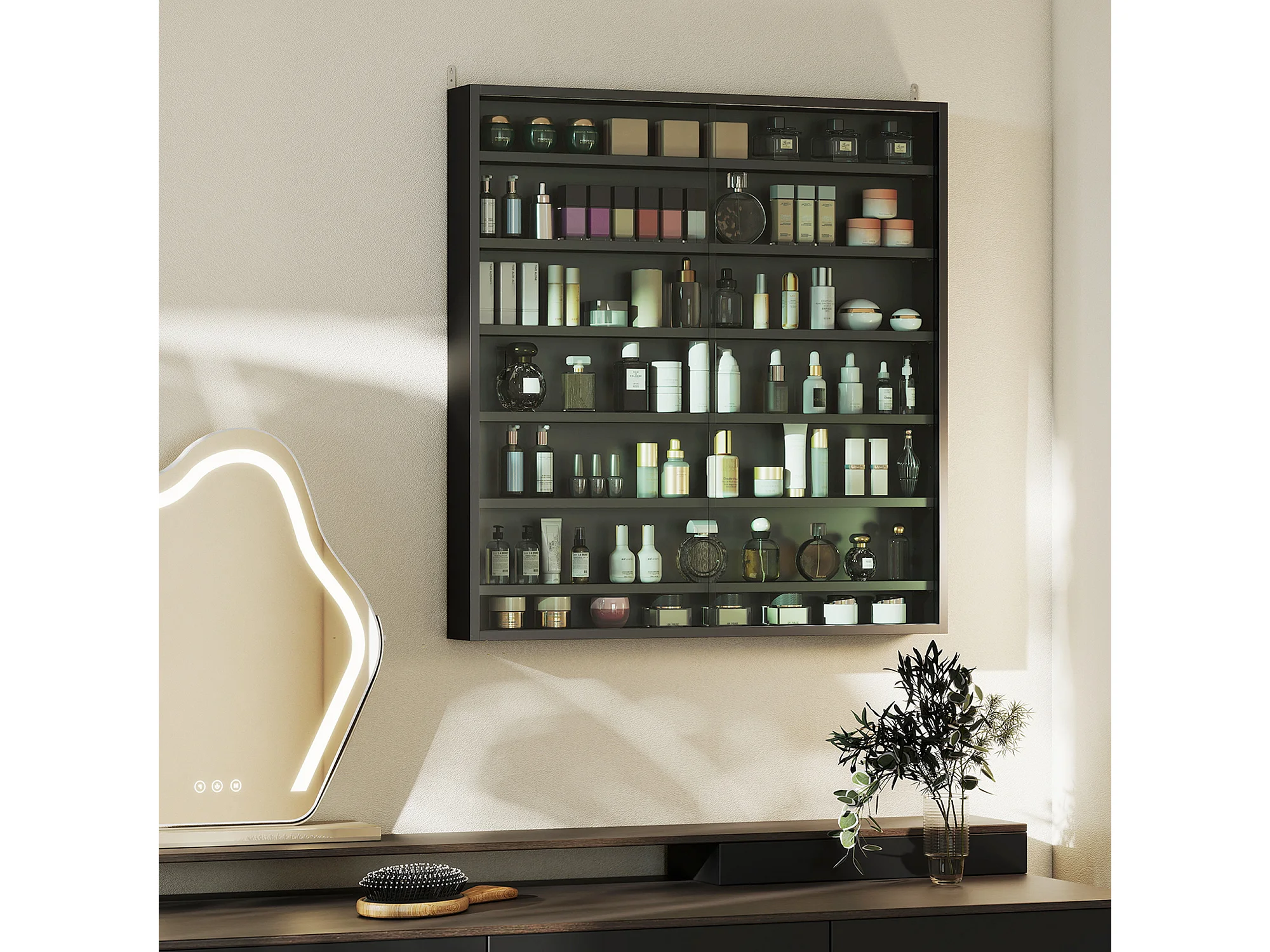 Vetrina in vetro a 5 ripiani con illuminazione LED personalizzabile – Base nera