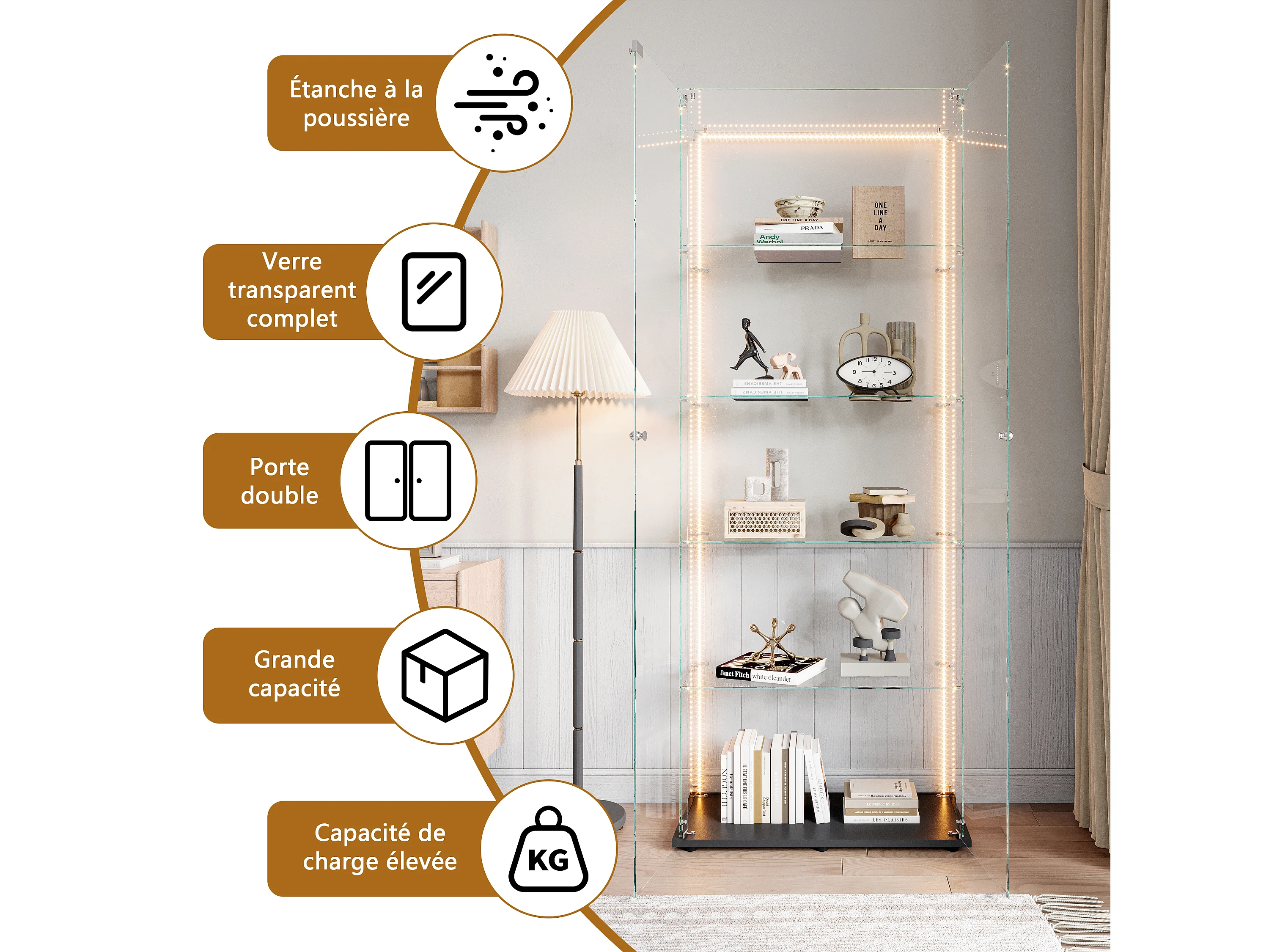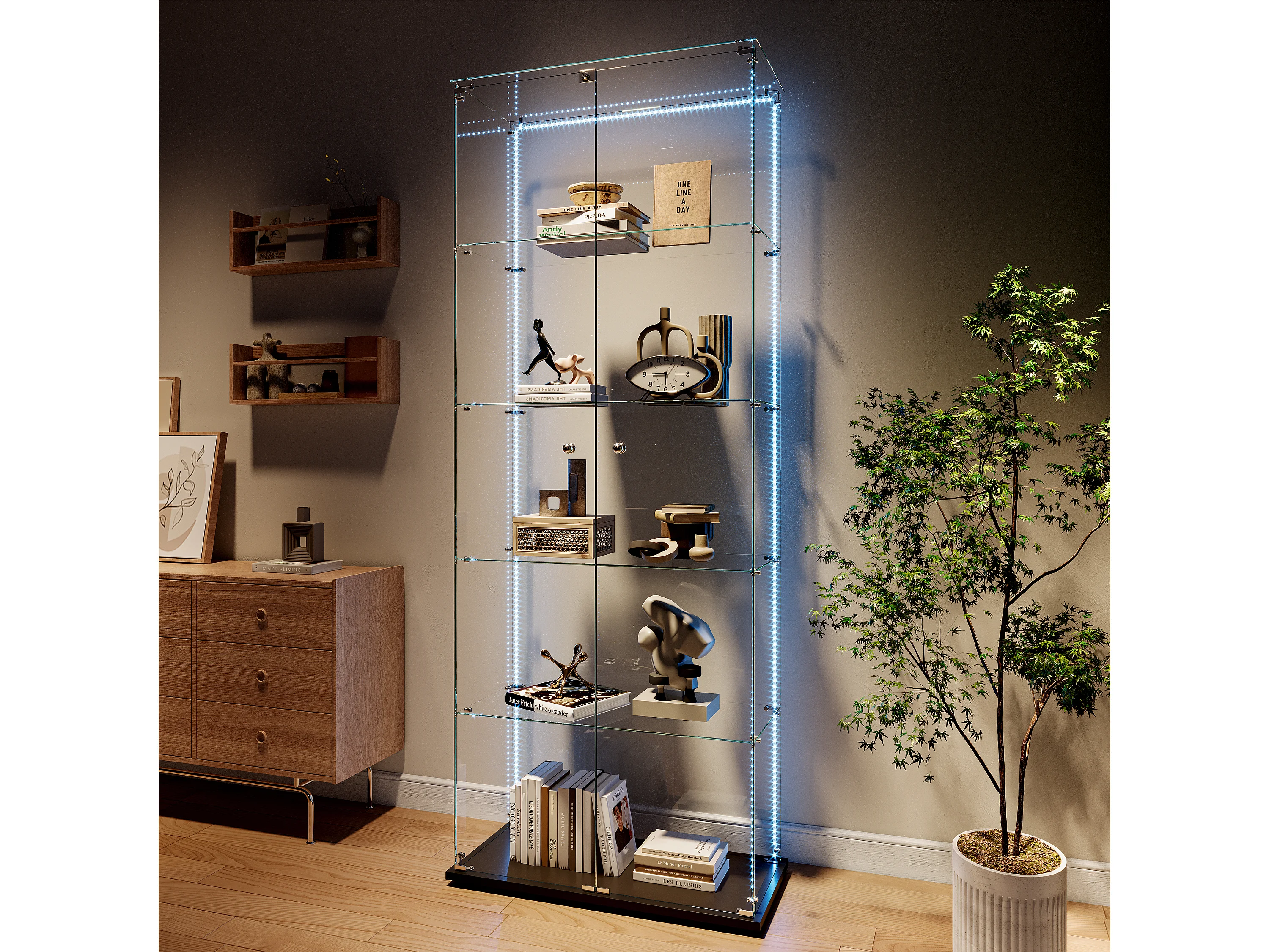 Vetrina in vetro a 5 ripiani con illuminazione LED personalizzabile – Base nera