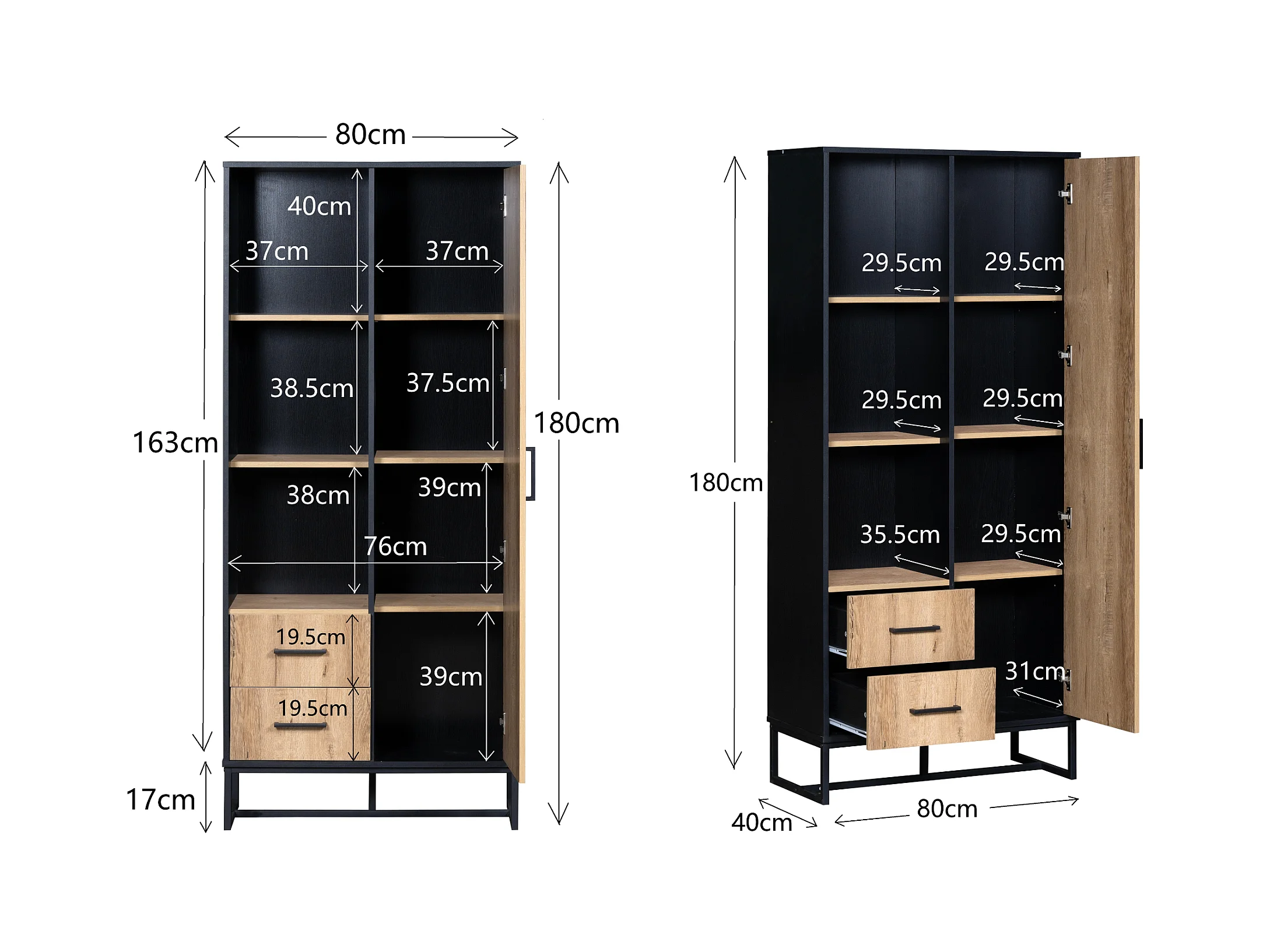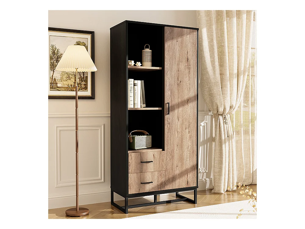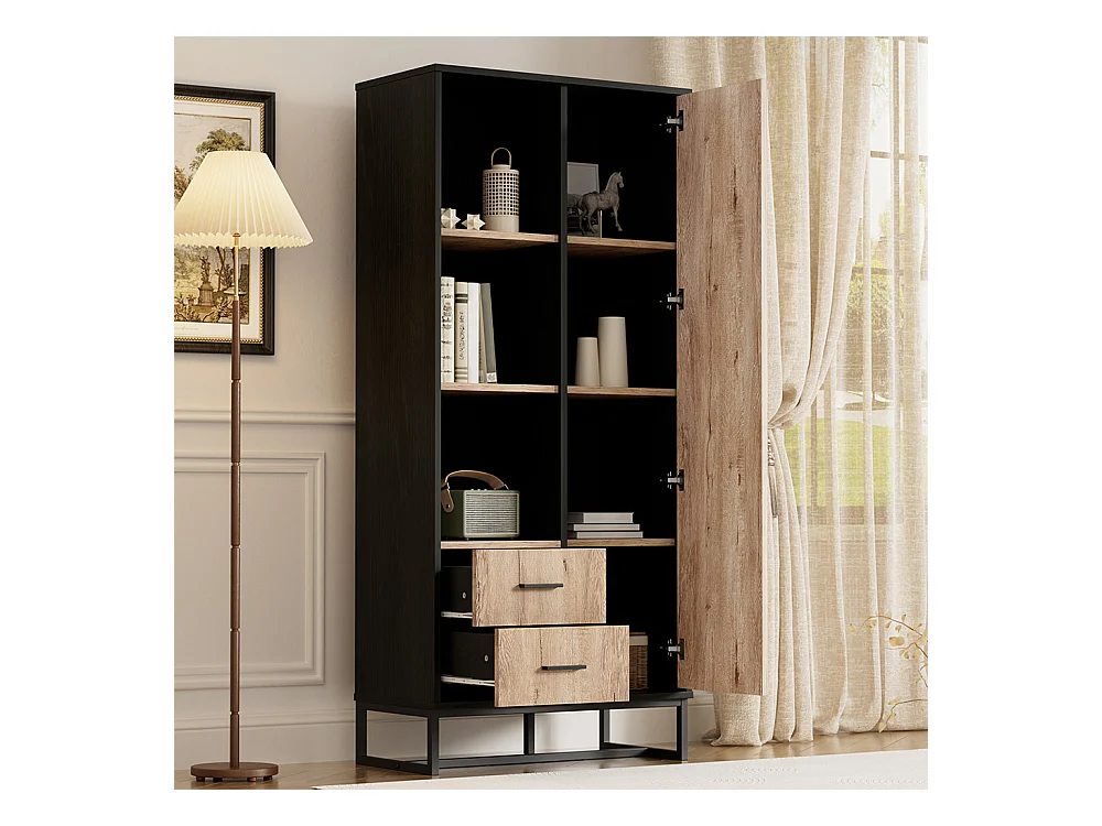 Vetrina moderna 80x40x180 cm - Esterno in legno, struttura nera, con ante, 2 cassetti e 3 vani a giorno