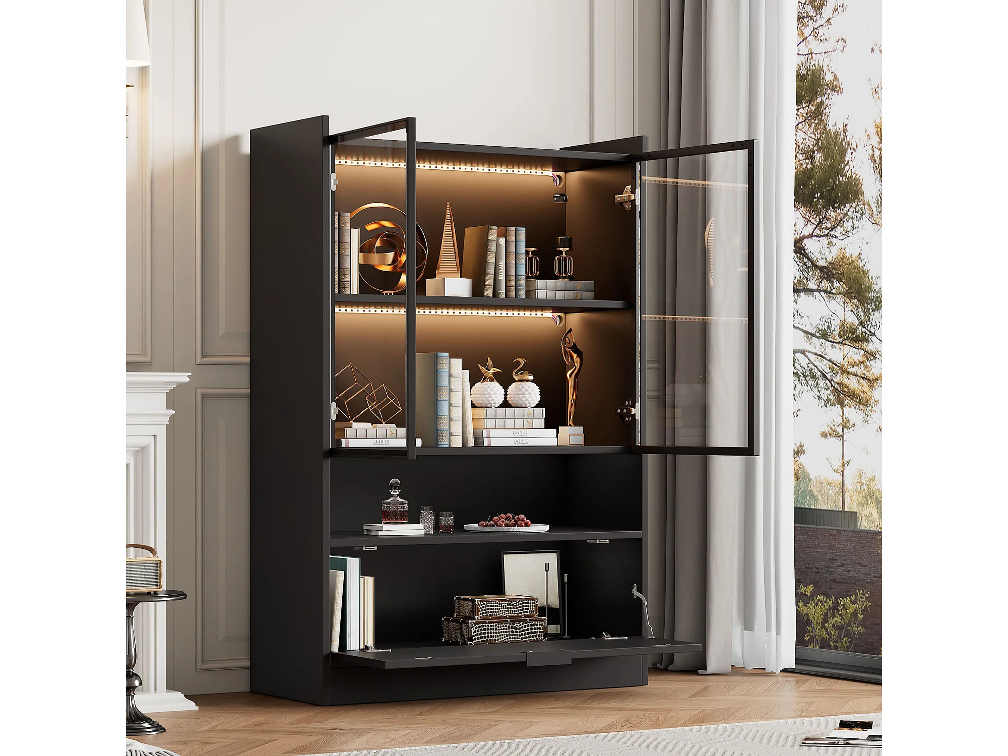 Vetrina laccata nera con ante in vetro, ripiano LED, 3 cassetti, 60x35x180 cm