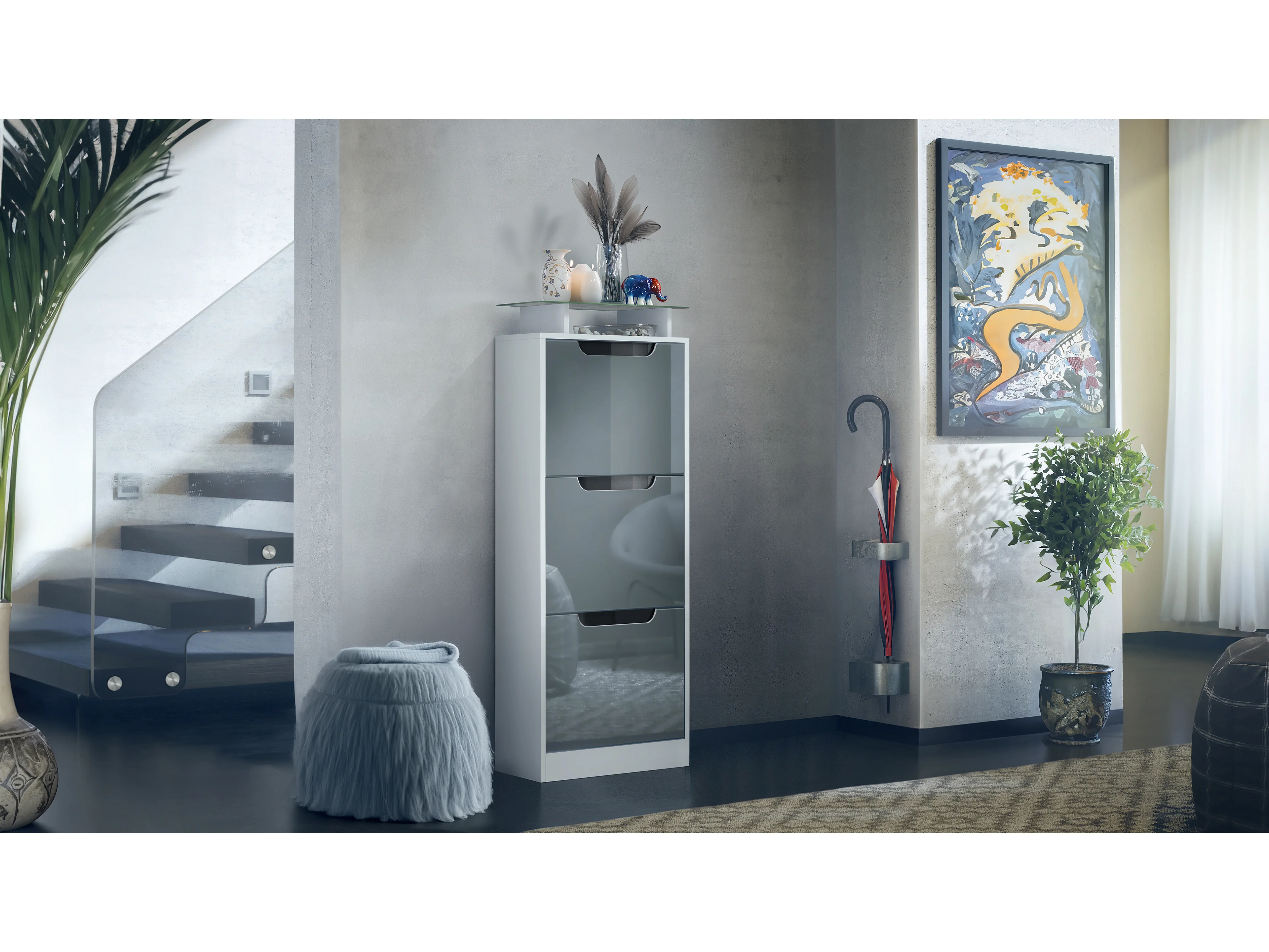 Vladon Scarpiera Space V2, Scarpiera per 12 paia di scarpe con 3 ribalte e ripiano in vetro, bianco opaco/grigio lucido (46 x 128 x 23 cm)
