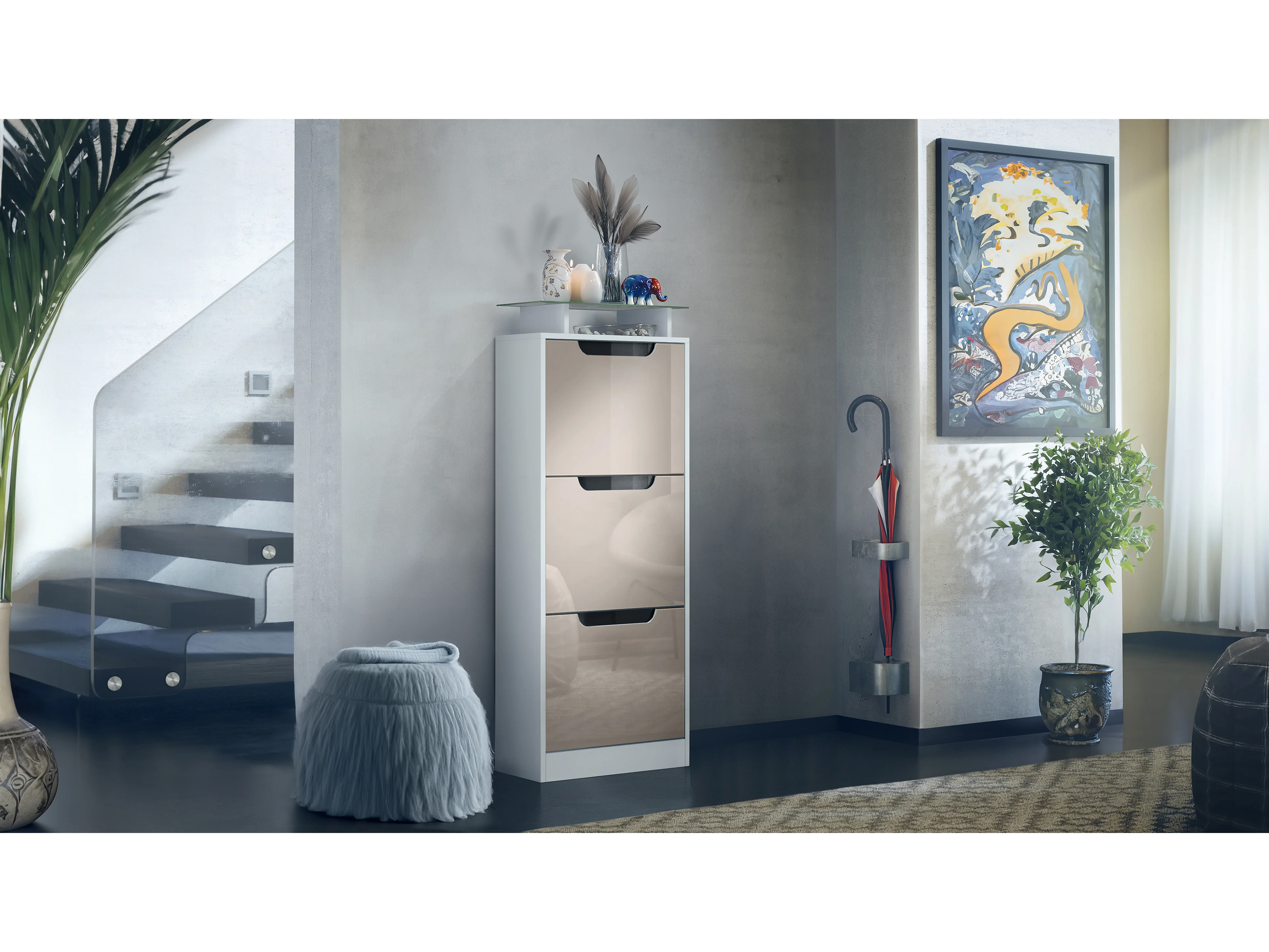 Vladon Scarpiera Space V2, Scarpiera per 12 paia di scarpe con 3 ribalte e ripiano in vetro, bianco opaco/grigio sabbia lucido (46 x 128 x 23 cm)