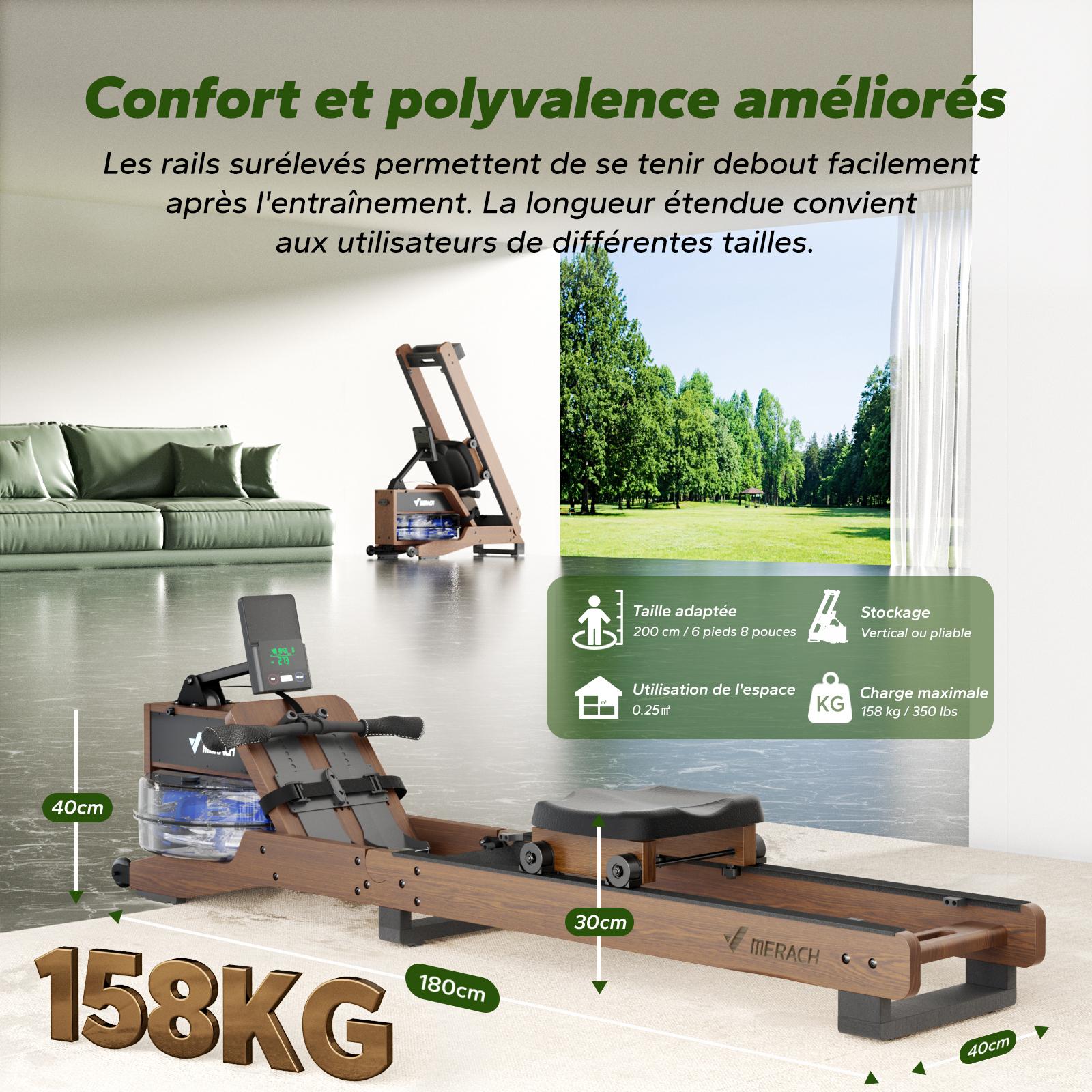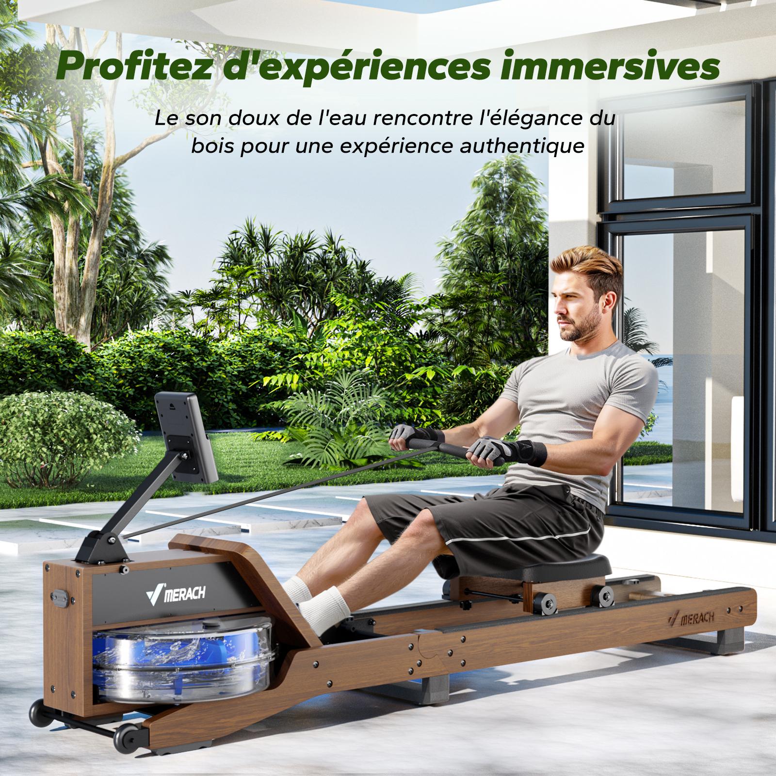 Vogatore ad acqua da appartamento Merach, sedile ergonomico, legno massiccio, compatibile Zwift e Kinomap, max carico 150 kg