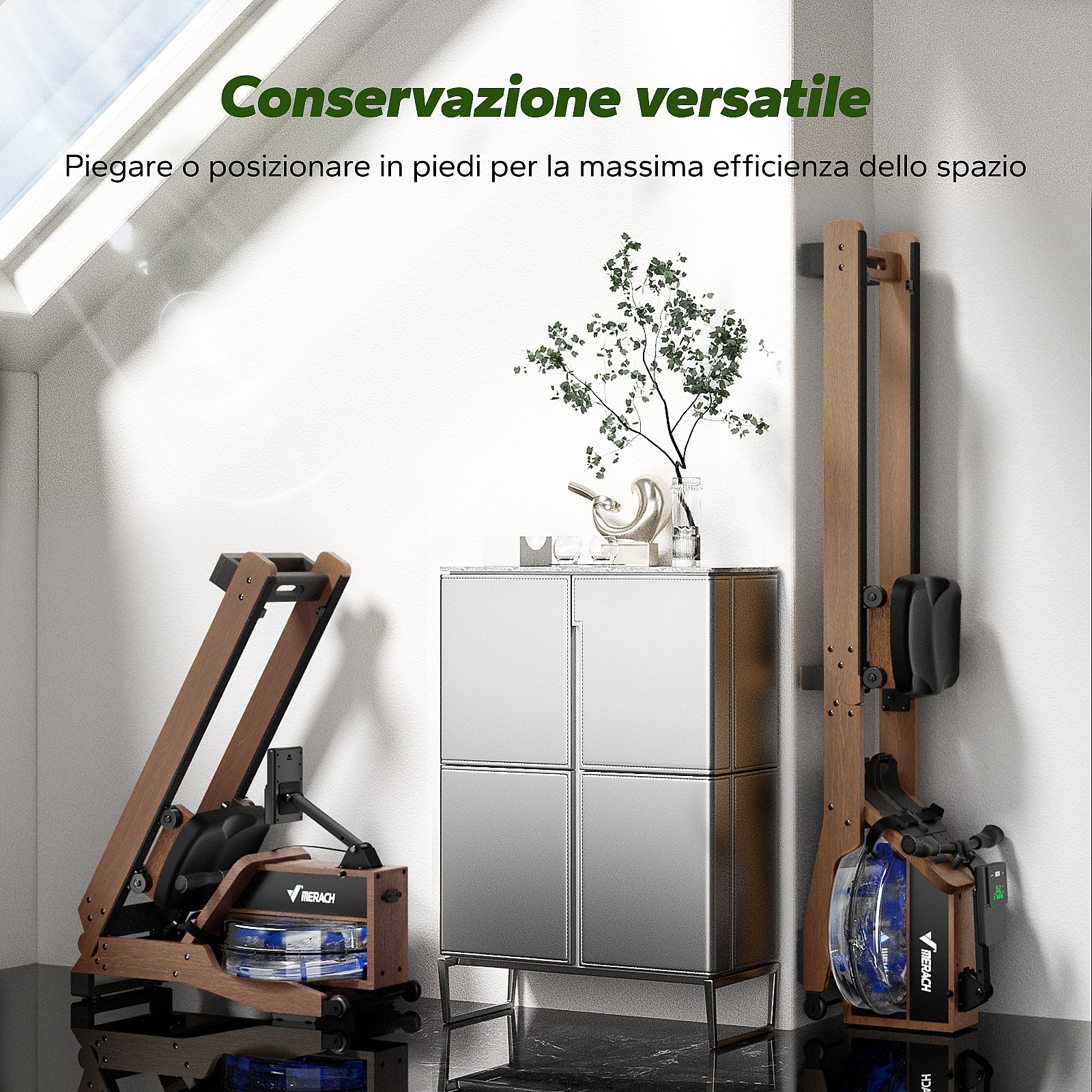 Vogatore ad acqua in legno Merach, 6 livelli di resistenza, schermo LCD, app connessa, serbatoio acqua 15L, regolazione manuale