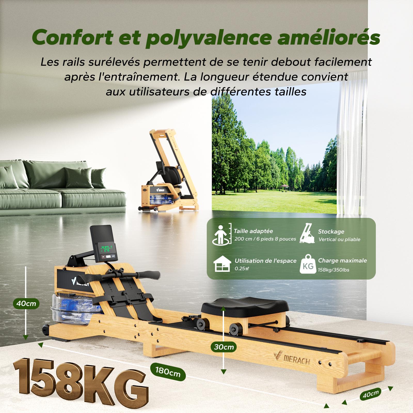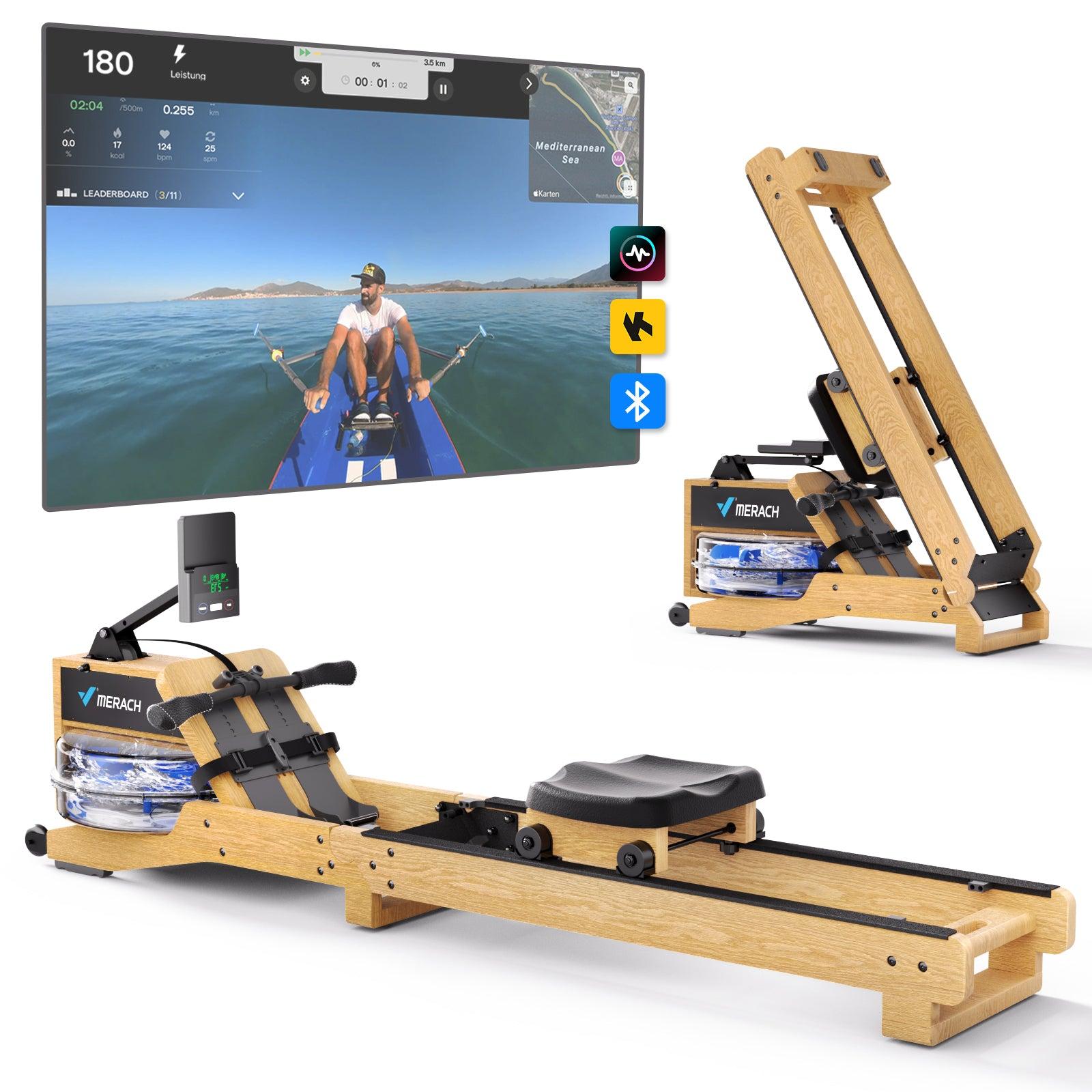 Vogatore ad acqua da appartamento Merach, sedile ergonomico, legno massiccio, compatibile Zwift e Kinomap, max carico 150 kg