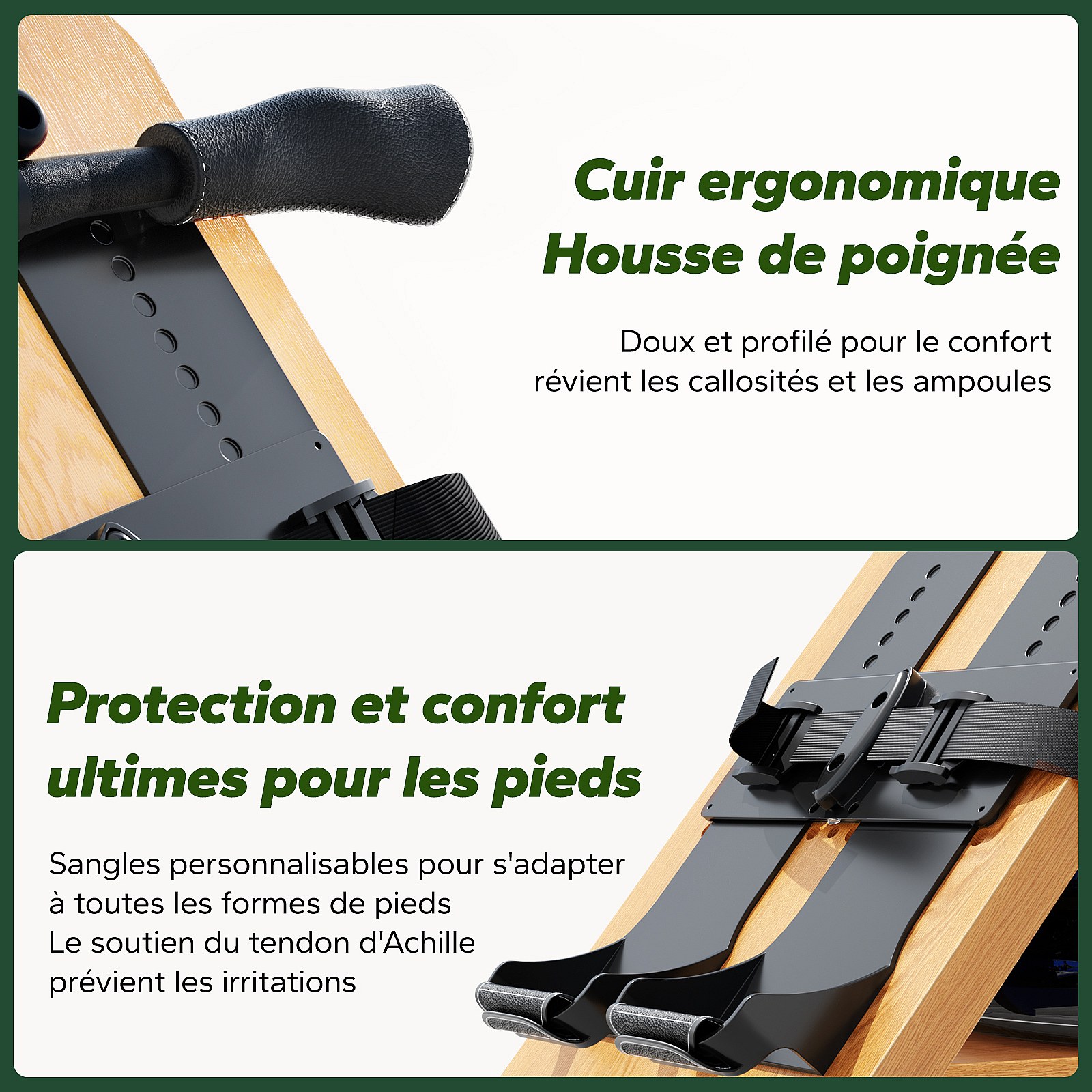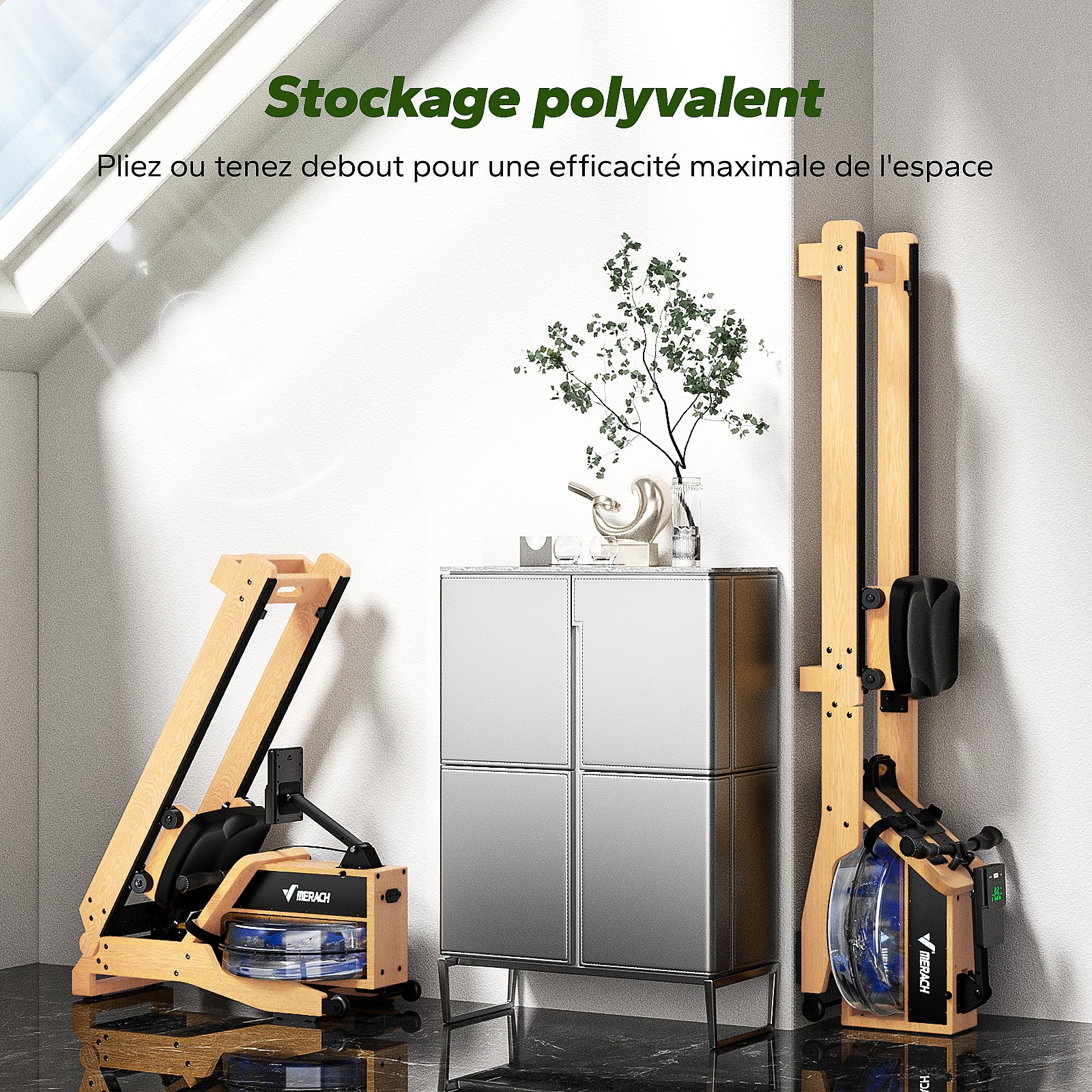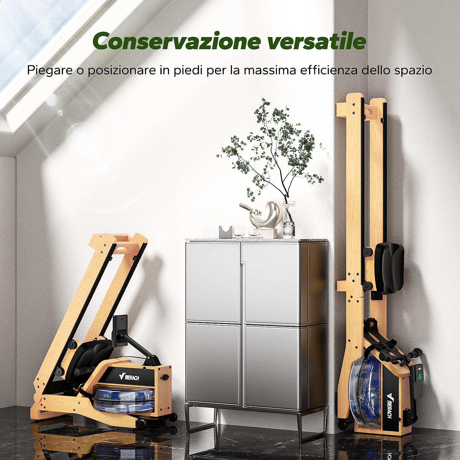 Vogatore ad acqua in legno Merach, 6 livelli di resistenza, schermo LCD, app connessa, serbatoio acqua 15L, regolazione manuale