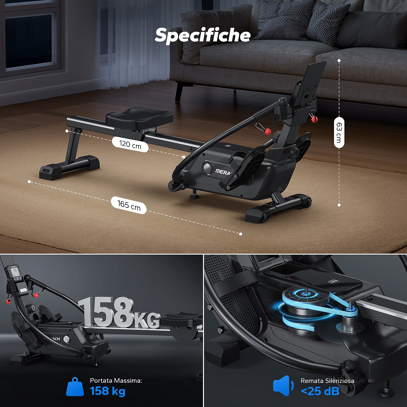 Vogatore Merach, 16 livelli di resistenza, due binari, carico massimo 160 kg, compatibile con APP