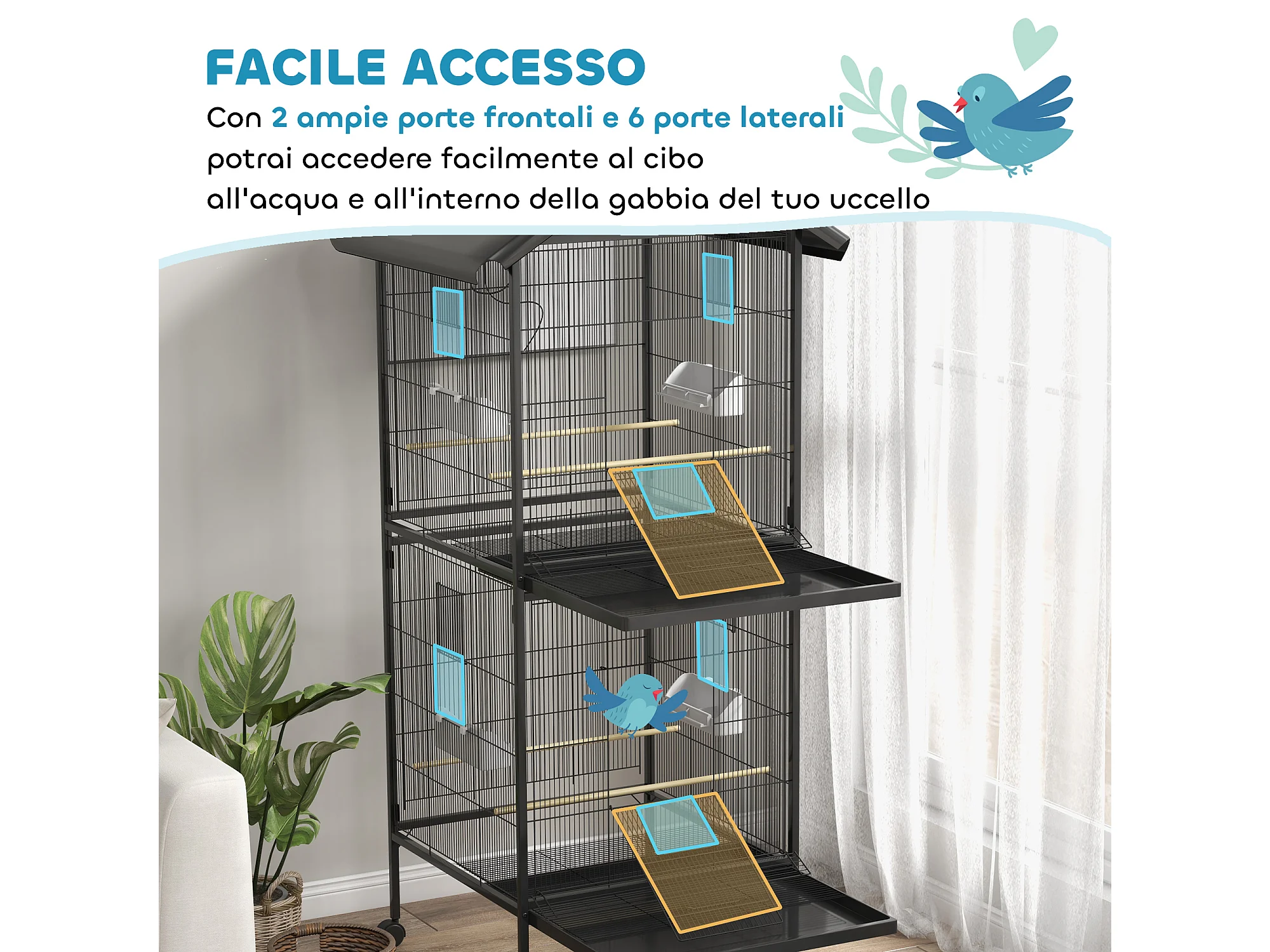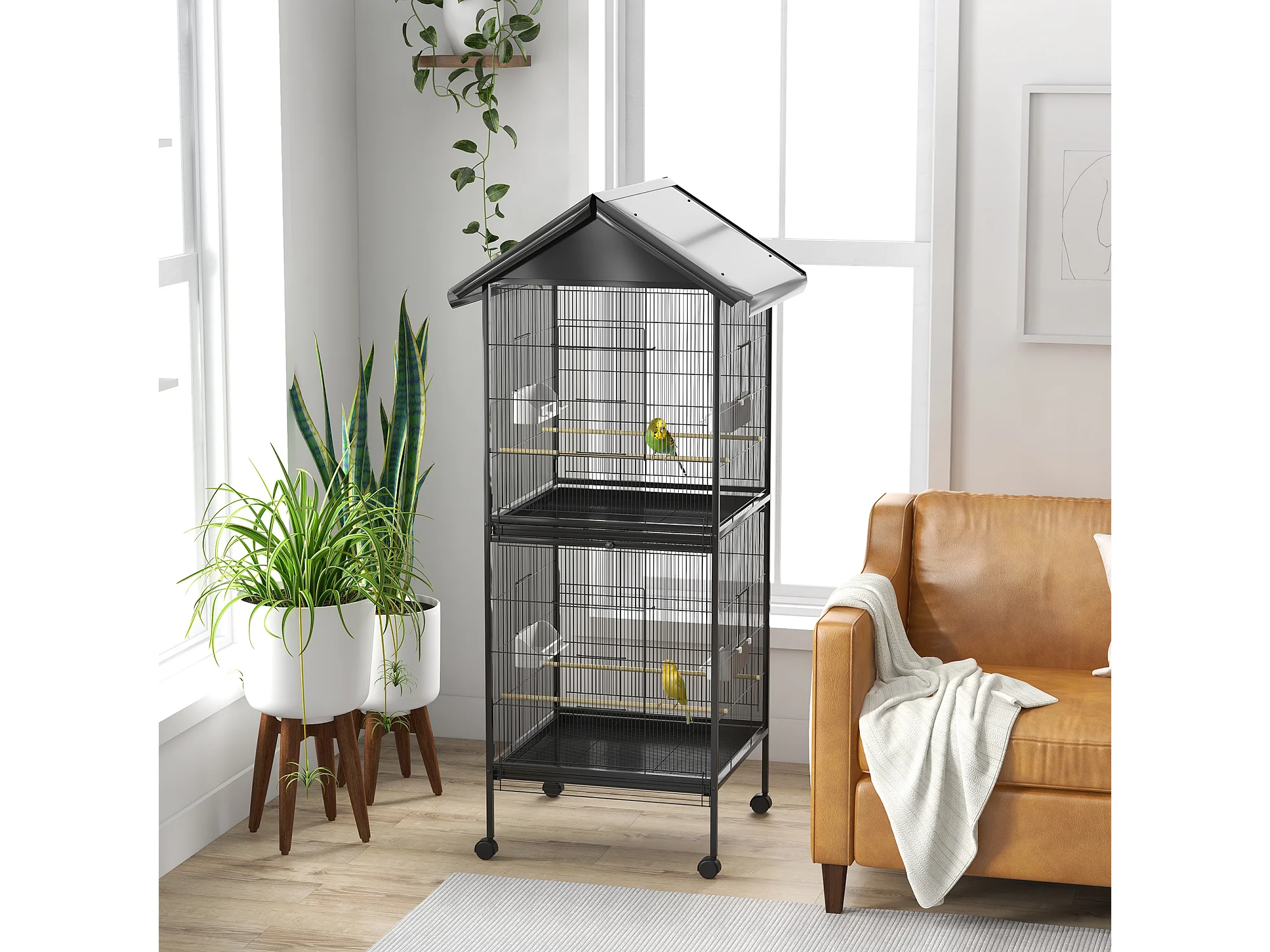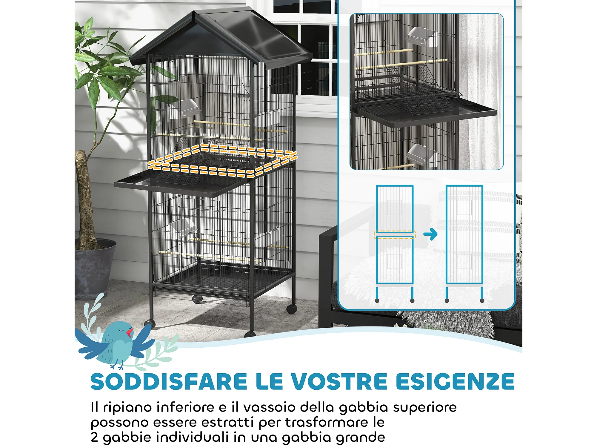 Gabbia voliera per uccelli 2 in 1 con ruote e vassoi estraibili nero