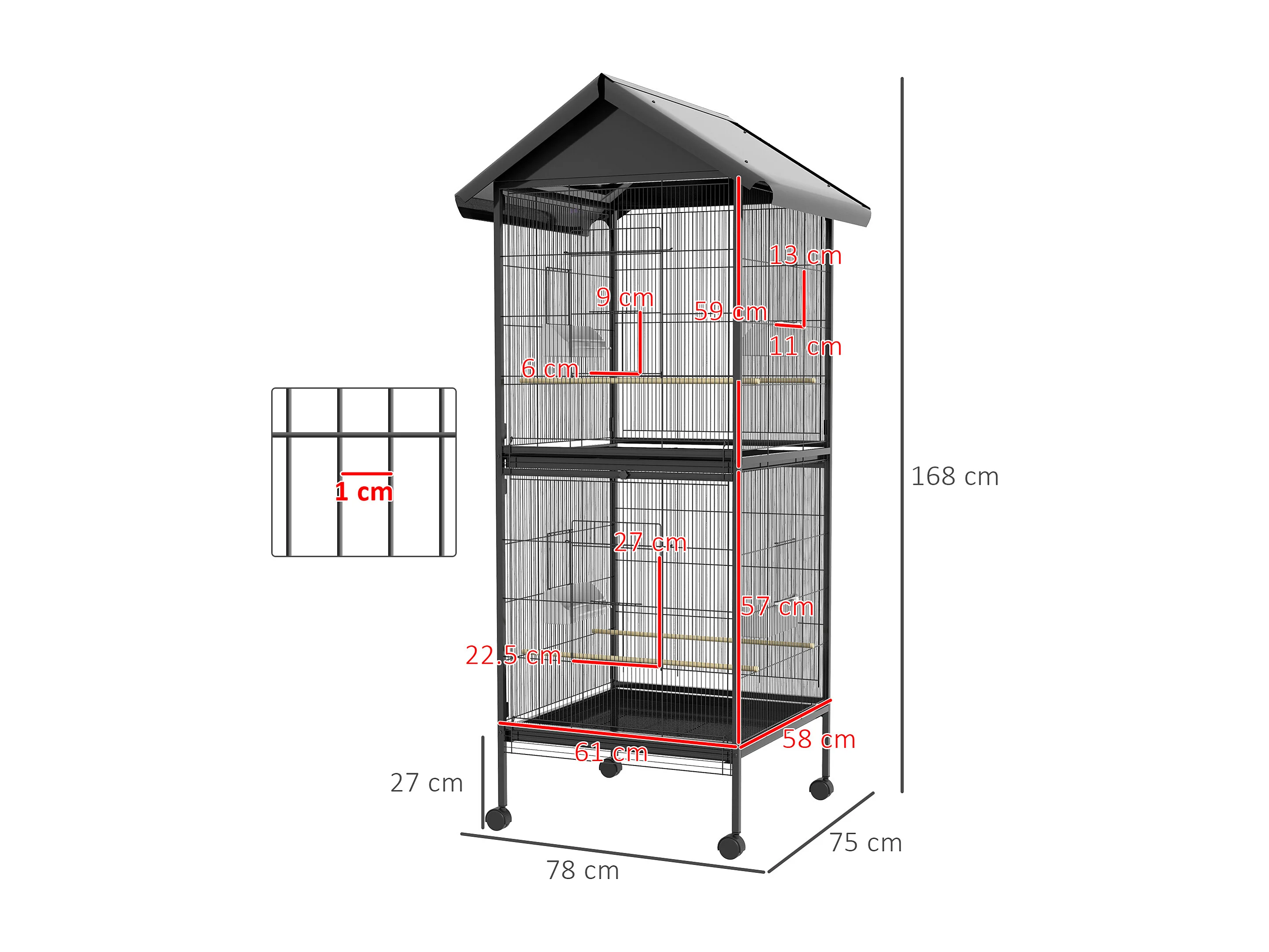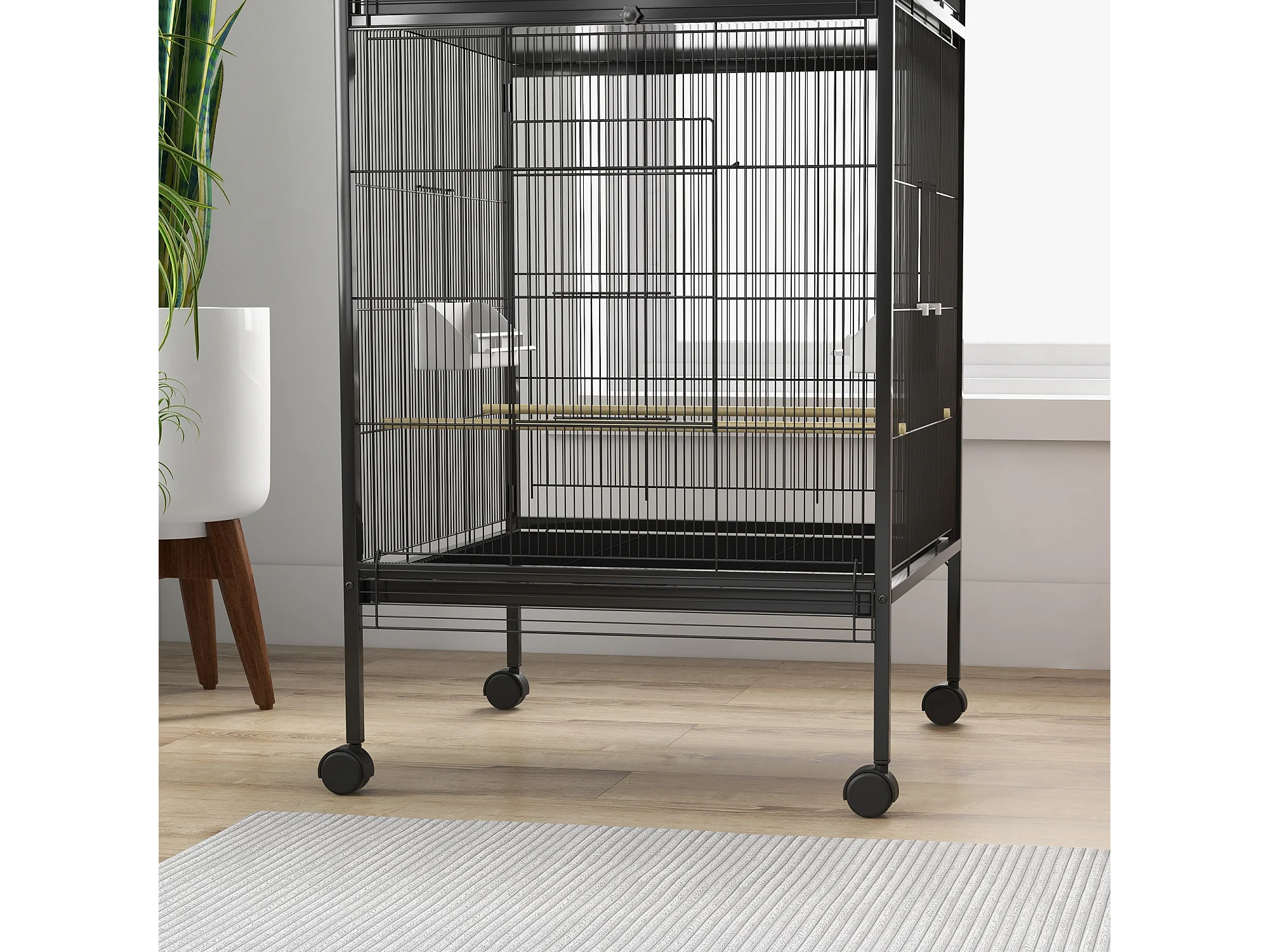 Gabbia per uccelli a ruote con ripiano inferiore, vassoio e griglia nero
