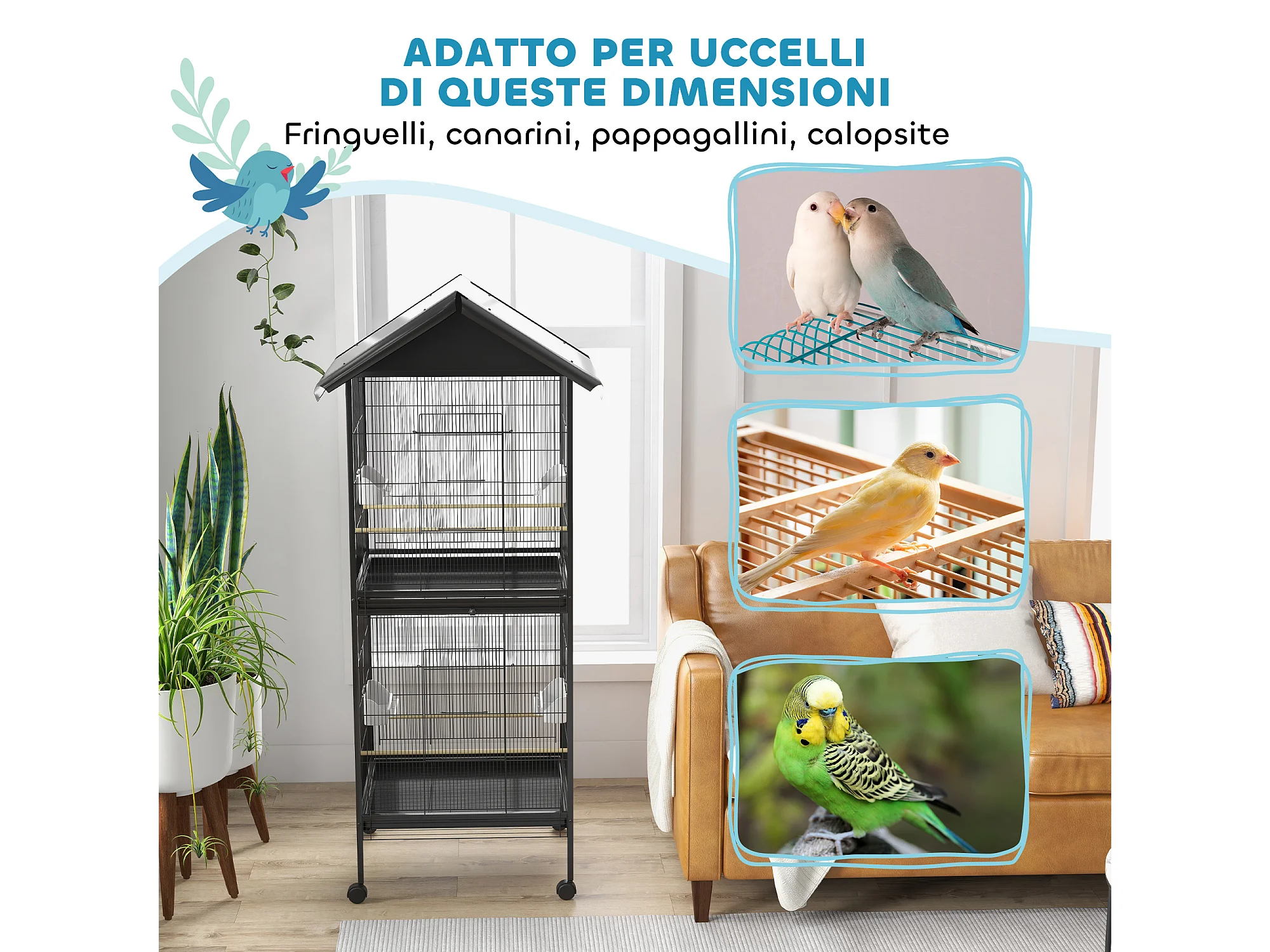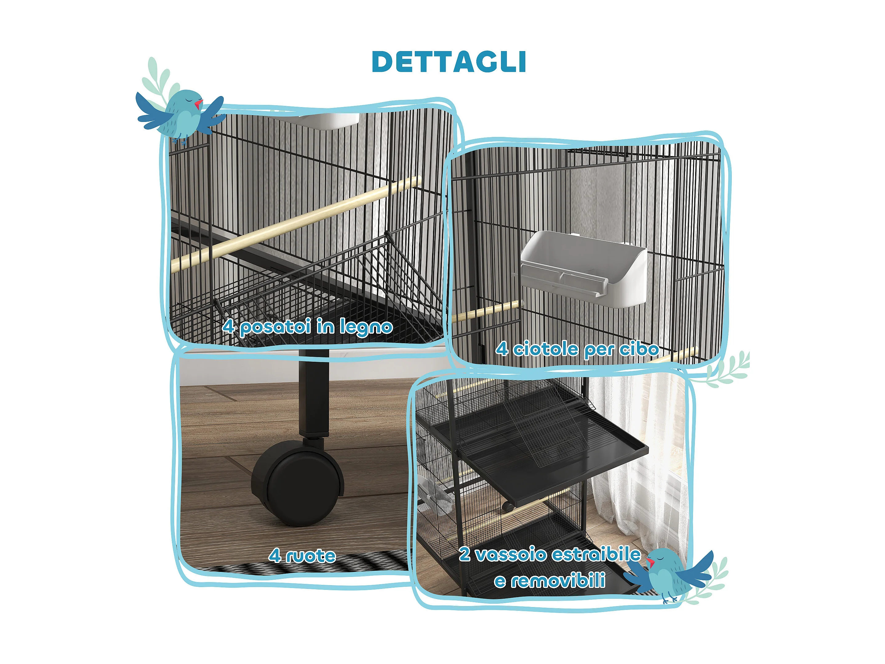 Gabbia per uccelli da interni in acciaio e legno a 4 ruote con trespolo
