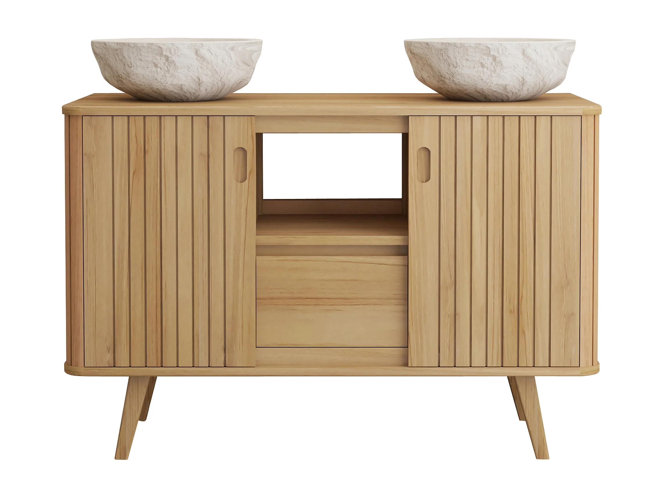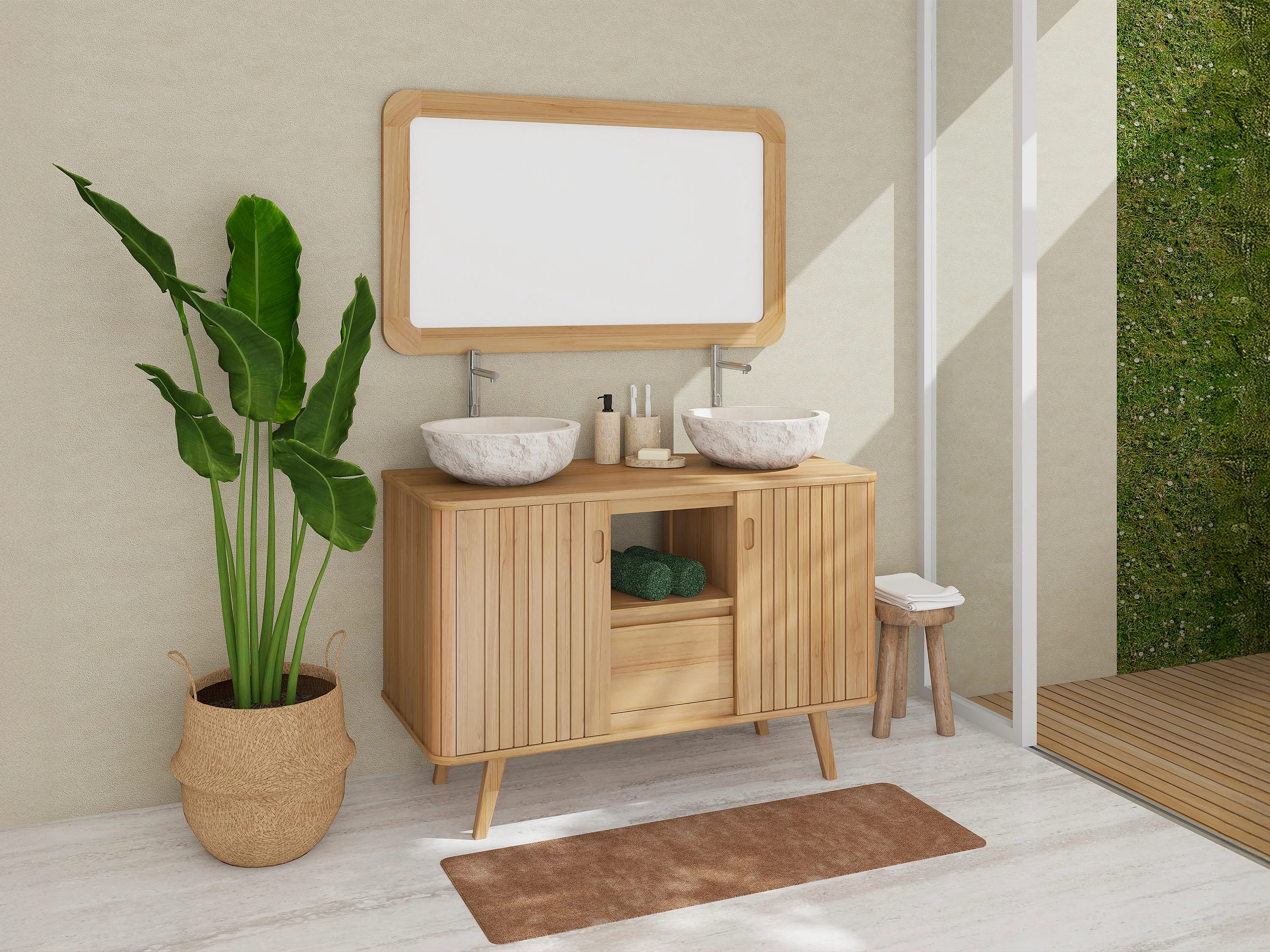 Mobile bagno con piedi in teak e doppio lavabo da appoggio in pietra crema 120 cm - WAMENA