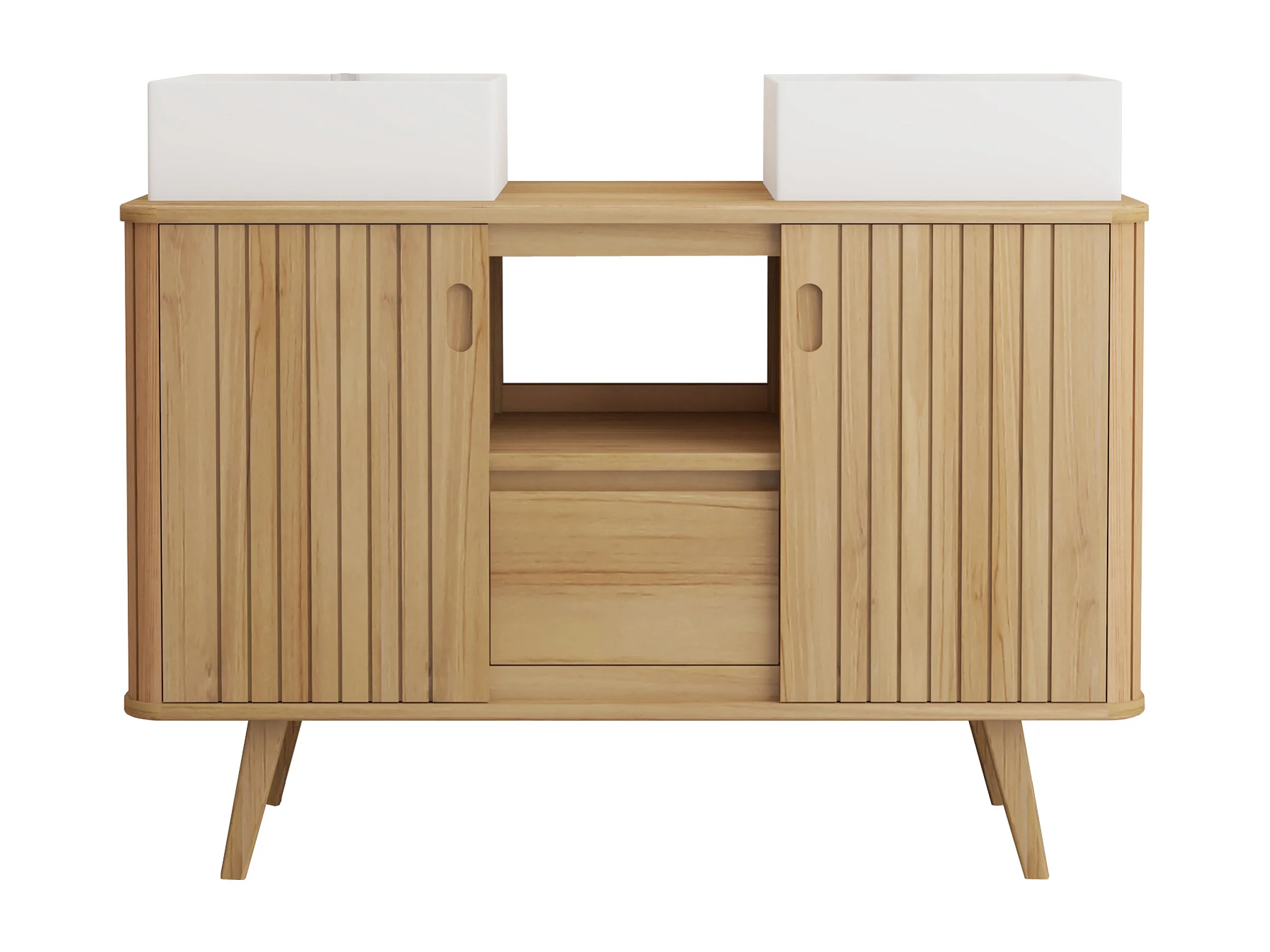Mobile bagno con piedi in teak e doppio lavabo quadrato da appoggio in ceramica 120 cm - WAMENA